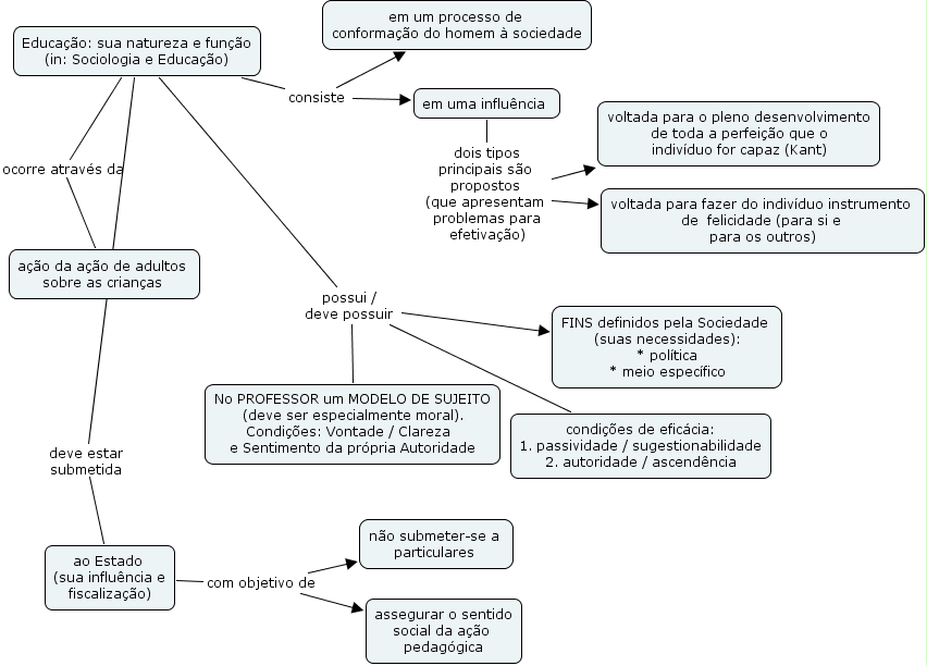 A Educação - sua natureza e função, ao Estado (sua influência e fiscalização) com objetivo de não submeter-se a particulares, Educação: sua natureza e função (in: Sociologia e Educação) deve estar submetida ao Estado (sua influência e fiscalização), Educação: sua natureza e função (in: Sociologia e Educação) consiste em um processo de conformação do homem à sociedade, Educação: sua natureza e função (in: Sociologia e Educação) consiste em uma influência, em uma influência dois tipos principais são propostos (que apresentam problemas para efetivação) voltada para fazer do indivíduo instrumento de felicidade (para si e para os outros), Educação: sua natureza e função (in: Sociologia e Educação) possui / deve possuir No PROFESSOR um MODELO DE SUJEITO (deve ser especialmente moral). Condições: Vontade / Clareza e Sentimento da própria Autoridade, Educação: sua natureza e função (in: Sociologia e Educação) ocorre através da ação da ação de adultos sobre as crianças, Educação: sua natureza e função (in: Sociologia e Educação) possui / deve possuir FINS definidos pela Sociedade (suas necessidades): * política * meio específico, Educação: sua natureza e função (in: Sociologia e Educação) possui / deve possuir condições de eficácia: 1. passividade / sugestionabilidade 2. autoridade / ascendência, ao Estado (sua influência e fiscalização) com objetivo de assegurar o sentido social da ação pedagógica