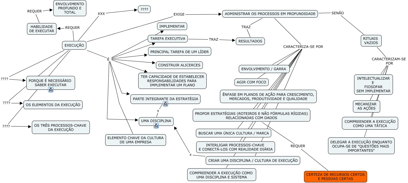 Esse mapa conceitual, produzido no IHMC CmapTools, tem a informação relacionada a: EXECUÇÃO2, EXECUÇÃO É ELEMENTO CHAVE DA CULTURA DE UMA EMPRESA, ADMINISTRAR OS PROCESSOS EM PROFUNDIDADE CARACTERIZA-SE POR ÊNFASE EM PLANOS DE AÇÃO PARA CRESCIMENTO, MERCADOS, PRODUTIVIDADE E QUALIDADE, EXECUÇÃO EXIGE ADMINISTRAR OS PROCESSOS EM PROFUNDIDADE, EXECUÇÃO É PARTE INTEGRANTE DA ESTRATÉGIA, RITUAIS VAZIOS CARACTERIZAM-SE POR DELEGAR A EXECUÇÃO ENQUANTO OCUPA-SE DE "QUESTÕES MAIS IMPORTANTES", EXECUÇÃO É TER CAPACIDADE DE ESTABELECER RESPONSABILIDADES PARA IMPLEMENTAR UM PLANO, ADMINISTRAR OS PROCESSOS EM PROFUNDIDADE CARACTERIZA-SE POR COMPREENDER A EXECUÇÃO COMO UMA DISCIPLINA E SISTEMA, CRIAR UMA DISCIPLINA / CULTURA DE EXECUÇÃO x UMA DISCIPLINA, PROPOR ESTRATÉGIAS (ROTEIROS E NÃO FÓRMULAS R�?GIDAS) RELACIONADAS COM DADOS REQUER CERTEZA DE RECURSOS CERTOS E PESSOAS CERTAS, EXECUÇÃO É UMA DISCIPLINA, EXECUÇÃO XXX ????, EXECUÇÃO ???? OS ELEMENTOS DA EXECUÇÃO, EXECUÇÃO ???? OS TRÊS PROCESSOS-CHAVE DA EXECUÇÃO, EXECUÇÃO É IMPLEMENTAR, TAREFA EXECUTIVA TRAZ RESULTADOS, ADMINISTRAR OS PROCESSOS EM PROFUNDIDADE CARACTERIZA-SE POR BUSCAR UMA ÚNICA CULTURA / MARCA, RITUAIS VAZIOS CARACTERIZAM-SE POR COMPREENDER A EXECUÇÃO COMO UMA T�?TICA, EXECUÇÃO É CONSTRUIR ALICERCES, ADMINISTRAR OS PROCESSOS EM PROFUNDIDADE TRAZ RESULTADOS, EXECUÇÃO ???? PORQUE É NECESS�?RIO SABER EXECUTAR