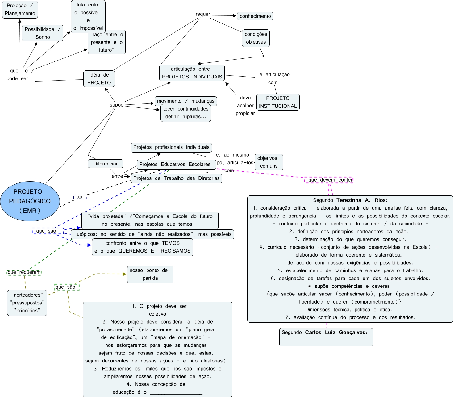 Esse mapa conceitual, produzido no IHMC CmapTools, tem a informação relacionada a: PROJETO POL�?TICO PEDAGÓGICO, Projetos Educativos Escolares que são utópicos: no sentido de "ainda não realizados", mas possíveis, idéia de PROJETO requer condições objetivas, Diferenciar entre Projetos de Trabalho das Diretorias, Projetos profissionais individuais e, ao mesmo tempo, articulá-los com objetivos comuns, idéia de PROJETO que é / pode ser Projeção / Planejamento, Diferenciar entre Projetos Educativos Escolares, condições objetivas x articulação entre PROJETOS INDIVIDUAIS, Projetos Educativos Escolares que são confronto entre o que TEMOS e o que QUEREMOS E PRECISAMOS, Projetos Educativos Escolares que requerem "norteadores" "pressupostos" "princípios", Projetos Educativos Escolares que devem conter Segundo Carlos Luiz Gonçalves:, PROJETO PEDAGÓGICO (EMR) supõe tecer continuidades definir rupturas..., idéia de PROJETO requer conhecimento, Projetos Educativos Escolares que são "vida projetada" /"Começamos a Escola do futuro no presente, nas escolas que temos", articulação entre PROJETOS INDIVIDUAIS e articulação com PROJETO INSTITUCIONAL, "norteadores" "pressupostos" "princípios" que são 1. O projeto deve ser coletivo 2. Nosso projeto deve considerar a idéia de "provisoriedade" (elaboraremos um "plano geral de edificação", um "mapa de orientação" - nos esforçaremos para que as mudanças sejam fruto de nossas decisões e que, estas, sejam decorrentes de nossas ações - e não aleatórias) 3. Reduziremos os limites que nos são impostos e ampliaremos nossas possibilidades de ação. 4. Nossa concepção de educação é o __________________, "norteadores" "pressupostos" "princípios" que são nosso ponto de partida, Projetos de Trabalho das Diretorias e, ao mesmo tempo, articulá-los com objetivos comuns, Diferenciar entre Projetos profissionais individuais, PROJETO PEDAGÓGICO (EMR) supõe articulação entre PROJETOS INDIVIDUAIS, idéia de PROJETO que é / pode ser "laço entre o presente e o futuro"