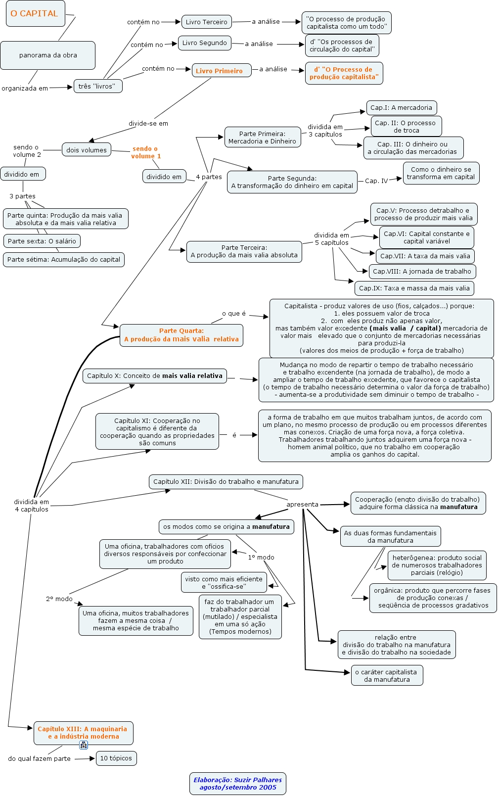 - O Capital -, Parte Terceira: A produção da mais valia absoluta dividida em 5 capítulos Cap.VI: Capital constante e capital variável, três "livros" contém no Livro Primeiro, Capítulo XII: Divisão do trabalho e manufatura apresenta o caráter capitalista da manufatura, Parte Terceira: A produção da mais valia absoluta dividida em 5 capítulos Cap.V: Processo detrabalho e processo de produzir mais valia, dividido em 3 partes Parte sétima: Acumulação do capital, Livro Terceiro a análise "O processo de produção capitalista como um todo", Livro Primeiro divide-se em dois volumes, Parte Primeira: Mercadoria e Dinheiro dividida em 3 capítulos Cap. III: O dinheiro ou a circulação das mercadorias, dividido em 4 partes Parte Segunda: A transformação do dinheiro em capital, As duas formas fundamentais da manufatura heterôgenea: produto social de numerosos trabalhadores parciais (relógio)