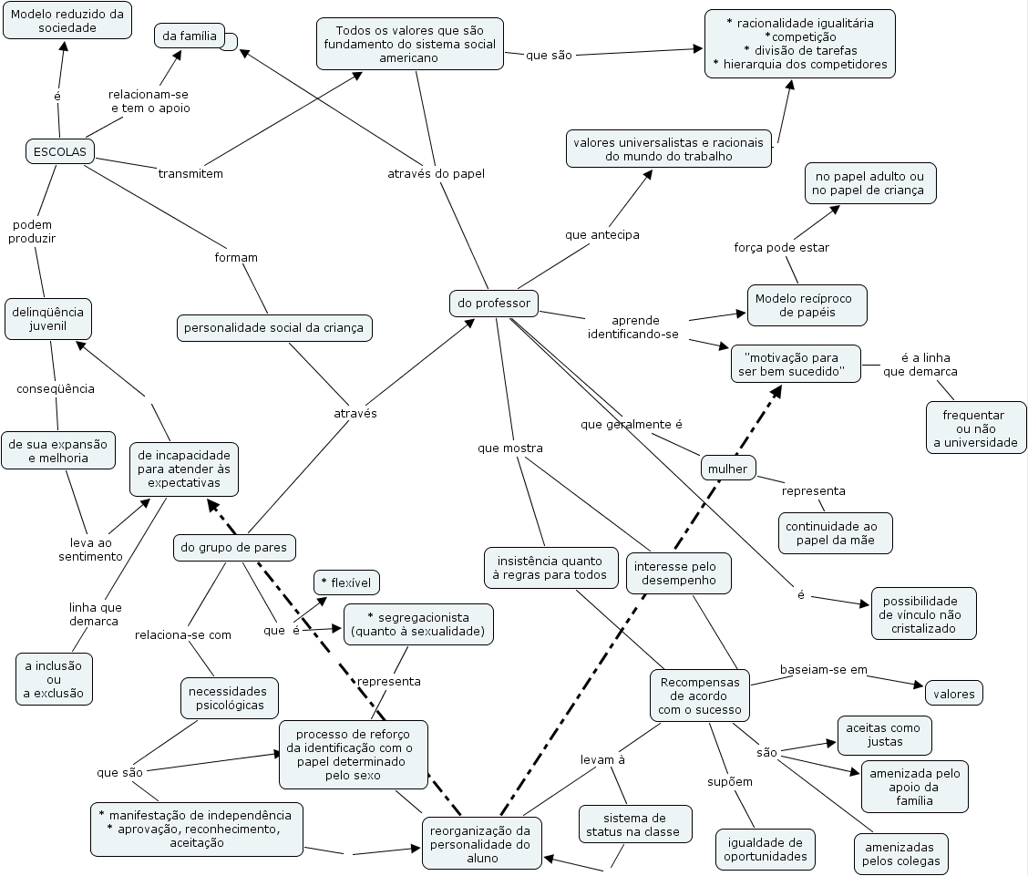 Parsons (socialização nas escolas), * manifestação de independência * aprovação, reconhecimento, aceitação reorganização da personalidade do aluno, Todos os valores que são fundamento do sistema social americano que são * racionalidade igualitária *competição * divisão de tarefas * hierarquia dos competidores, personalidade social da criança através do professor, do professor que mostra interesse pelo desempenho, de incapacidade para atender às expectativas linha que demarca a inclusão ou a exclusão, do professor aprende identificando-se "motivação para ser bem sucedido", mulher representa continuidade ao papel da mãe, do professor que mostra insistência quanto à regras para todos, ESCOLAS transmitem Todos os valores que são fundamento do sistema social americano, valores universalistas e racionais do mundo do trabalho * racionalidade igualitária *competição * divisão de tarefas * hierarquia dos competidores