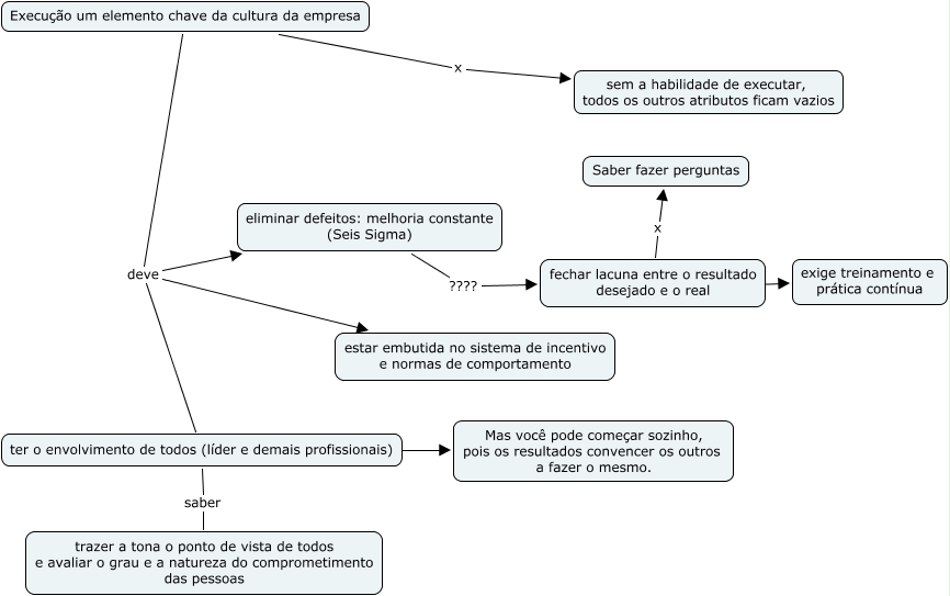 Esse mapa conceitual, produzido no IHMC CmapTools, tem a informação relacionada a: Execução elemento chave da cultura empresarial, Execução um elemento chave da cultura da empresa x sem a habilidade de executar, todos os outros atributos ficam vazios, ter o envolvimento de todos (líder e demais profissionais) ???? Mas você pode começar sozinho, pois os resultados convencer os outros a fazer o mesmo., eliminar defeitos: melhoria constante (Seis Sigma) ???? fechar lacuna entre o resultado desejado e o real, Execução um elemento chave da cultura da empresa deve ter o envolvimento de todos (líder e demais profissionais), fechar lacuna entre o resultado desejado e o real x Saber fazer perguntas, Execução um elemento chave da cultura da empresa deve eliminar defeitos: melhoria constante (Seis Sigma), fechar lacuna entre o resultado desejado e o real ???? exige treinamento e prática contínua, ter o envolvimento de todos (líder e demais profissionais) saber trazer a tona o ponto de vista de todos e avaliar o grau e a natureza do comprometimento das pessoas, Execução um elemento chave da cultura da empresa deve estar embutida no sistema de incentivo e normas de comportamento