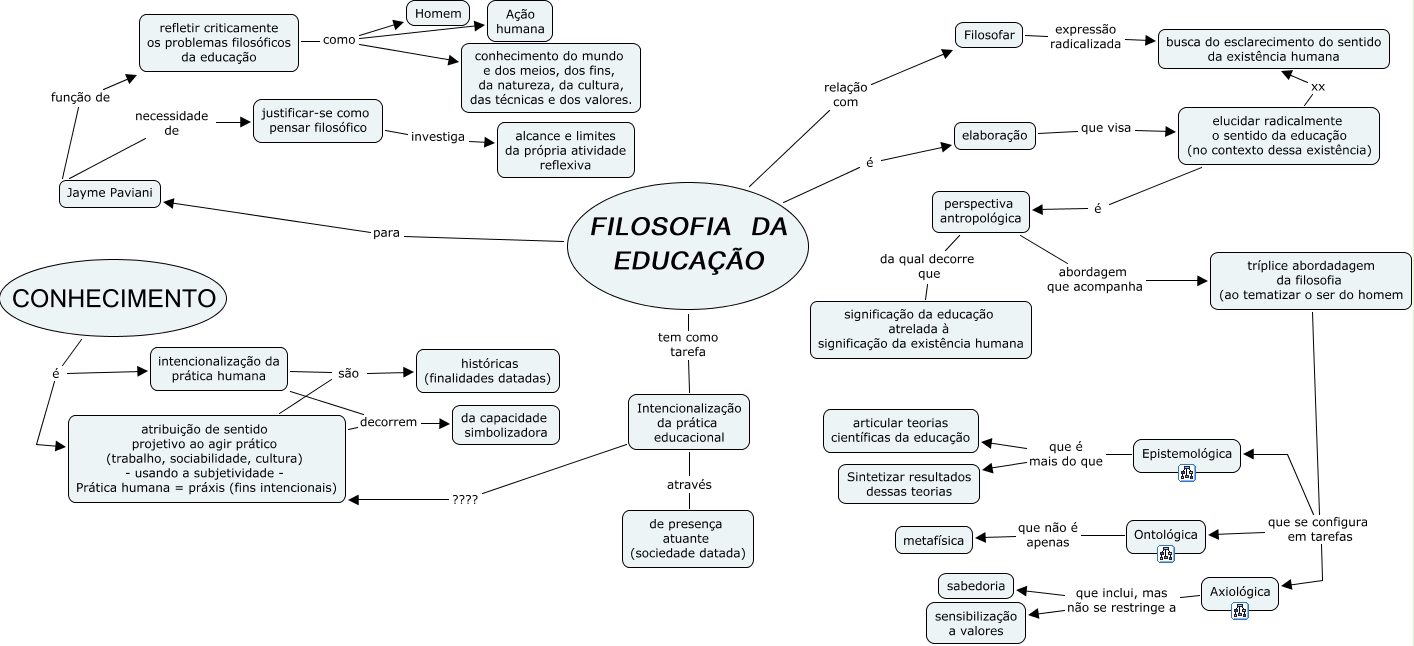 Esse mapa conceitual, produzido no IHMC CmapTools, tem a informação relacionada a: Identidade e tarefas da Filosofia da Educação, Jayme Paviani função de refletir criticamente os problemas filosóficos da educação, perspectiva antropológica da qual decorre que significação da educação atrelada à significação da existência humana, Axiológica que inclui, mas não se restringe a sensibilização a valores, FILOSOFIA DA EDUCAÇÃO relação com Filosofar, justificar-se como pensar filosófico investiga alcance e limites da própria atividade reflexiva, Filosofar expressão radicalizada busca do esclarecimento do sentido da existência humana, intencionalização da prática humana são históricas (finalidades datadas), refletir criticamente os problemas filosóficos da educação como Homem, tríplice abordadagem da filosofia (ao tematizar o ser do homem que se configura em tarefas Ontológica, FILOSOFIA DA EDUCAÇÃO é elaboração, Axiológica que inclui, mas não se restringe a sabedoria, FILOSOFIA DA EDUCAÇÃO para Jayme Paviani, perspectiva antropológica abordagem que acompanha tríplice abordadagem da filosofia (ao tematizar o ser do homem, tríplice abordadagem da filosofia (ao tematizar o ser do homem que se configura em tarefas Epistemológica, Jayme Paviani necessidade de justificar-se como pensar filosófico, refletir criticamente os problemas filosóficos da educação como conhecimento do mundo e dos meios, dos fins, da natureza, da cultura, das técnicas e dos valores., FILOSOFIA DA EDUCAÇÃO tem como tarefa Intencionalização da prática educacional, intencionalização da prática humana decorrem da capacidade simbolizadora, CONHECIMENTO é intencionalização da prática humana, elaboração que visa elucidar radicalmente o sentido da educação (no contexto dessa existência)