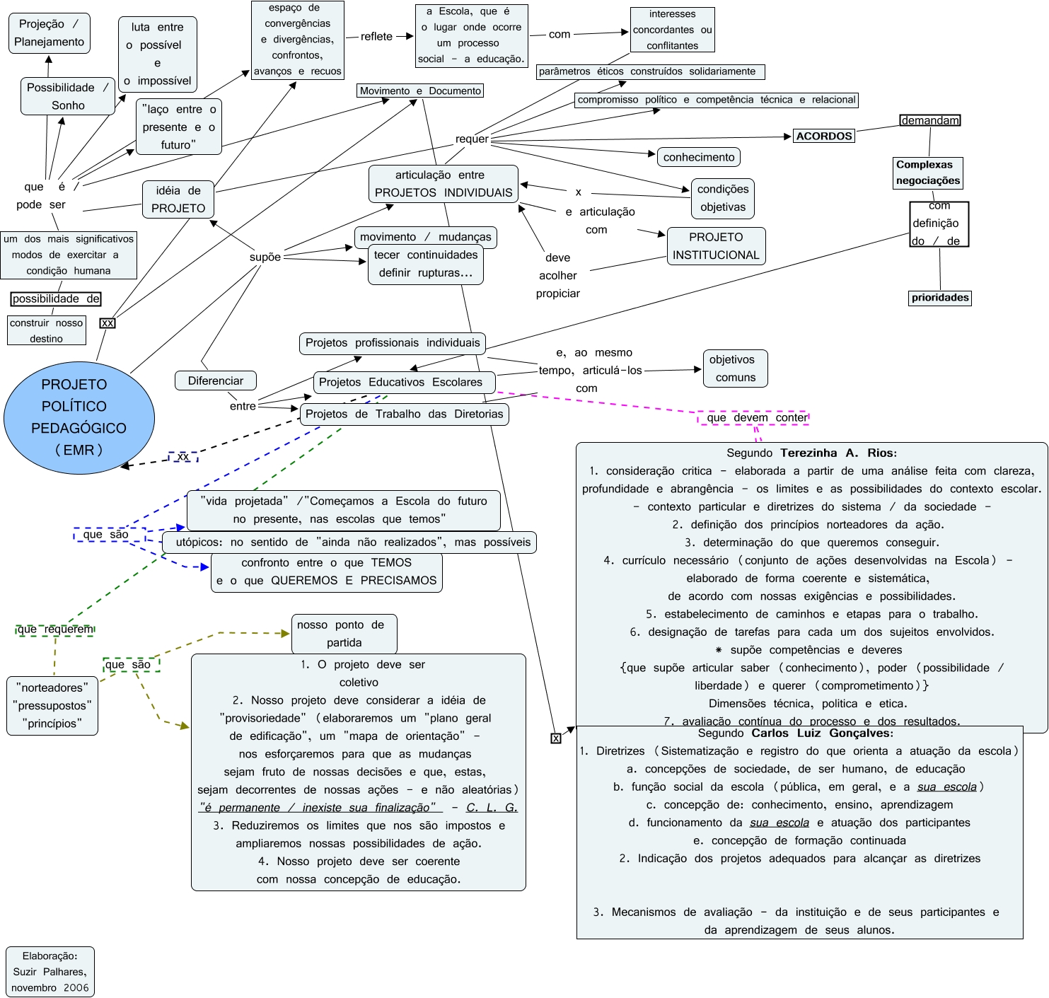 Esse mapa conceitual, produzido no IHMC CmapTools, tem a informação relacionada a: PROJETO POL�?TICO PEDAGÓGICO, Projetos Educativos Escolares que são utópicos: no sentido de "ainda não realizados", mas possíveis, idéia de PROJETO que é / pode ser um dos mais significativos modos de exercitar a condição humana, idéia de PROJETO requer condições objetivas, PROJETO POL�?TICO PEDAGÓGICO (EMR) xx espaço de convergências e divergências, confrontos, avanços e recuos, Complexas negociações com definição do / de Projetos Educativos Escolares, interesses concordantes ou conflitantes requer compromisso político e competência técnica e relacional, idéia de PROJETO que é / pode ser Projeção / Planejamento, Projetos profissionais individuais e, ao mesmo tempo, articulá-los com objetivos comuns, Diferenciar entre Projetos de Trabalho das Diretorias, interesses concordantes ou conflitantes requer condições objetivas, Projetos Educativos Escolares que são confronto entre o que TEMOS e o que QUEREMOS E PRECISAMOS, condições objetivas x articulação entre PROJETOS INDIVIDUAIS, Diferenciar entre Projetos Educativos Escolares, idéia de PROJETO requer ACORDOS, Projetos Educativos Escolares que devem conter Segundo Carlos Luiz Gonçalves: 1. Diretrizes (Sistematização e registro do que orienta a atuação da escola) a. concepções de sociedade, de ser humano, de educação b. função social da escola (pública, em geral, e a sua escola) c. concepção de: conhecimento, ensino, aprendizagem d. funcionamento da sua escola e atuação dos participantes e. concepção de formação continuada 2. Indicação dos projetos adequados para alcançar as diretrizes 3. Mecanismos de avaliação - da instituição e de seus participantes e da aprendizagem de seus alunos., Projetos Educativos Escolares que requerem "norteadores" "pressupostos" "princípios", interesses concordantes ou conflitantes requer conhecimento, um dos mais significativos modos de exercitar a condição humana possibilidade de construir nosso destino, PROJETO POL�?TICO PEDAGÓGICO (EMR) supõe tecer continuidades definir rupturas..., interesses concordantes ou conflitantes requer articulação entre PROJETOS INDIVIDUAIS