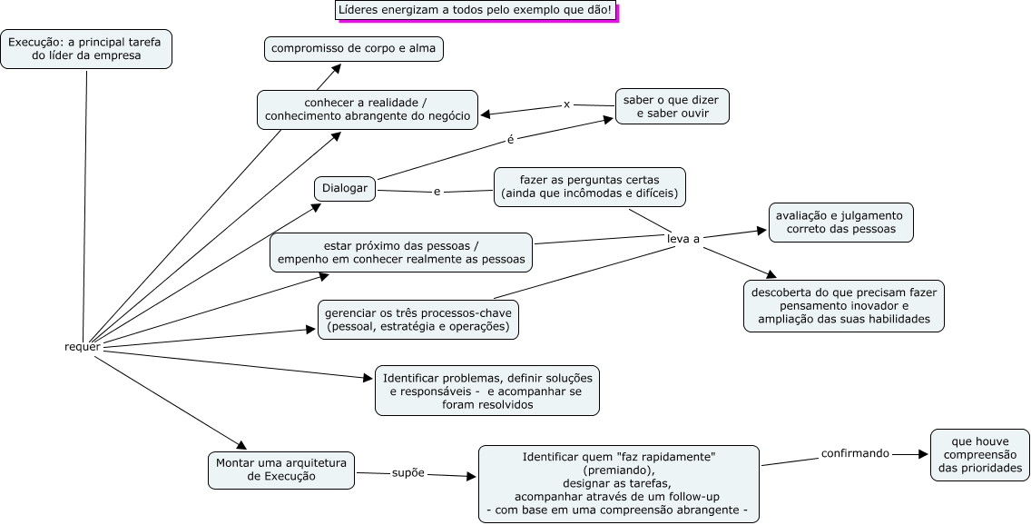 Esse mapa conceitual, produzido no IHMC CmapTools, tem a informação relacionada a: Execução tarefa do líder da empresa, Execução: a principal tarefa do líder da empresa requer conhecer a realidade / conhecimento abrangente do negócio, fazer as perguntas certas (ainda que incômodas e difíceis) leva a descoberta do que precisam fazer pensamento inovador e ampliação das suas habilidades, gerenciar os três processos-chave (pessoal, estratégia e operações) leva a descoberta do que precisam fazer pensamento inovador e ampliação das suas habilidades, Execução: a principal tarefa do líder da empresa requer gerenciar os três processos-chave (pessoal, estratégia e operações), Execução: a principal tarefa do líder da empresa requer Identificar problemas, definir soluções e responsáveis - e acompanhar se foram resolvidos, Dialogar é saber o que dizer e saber ouvir, Execução: a principal tarefa do líder da empresa requer estar próximo das pessoas / empenho em conhecer realmente as pessoas, estar próximo das pessoas / empenho em conhecer realmente as pessoas leva a avaliação e julgamento correto das pessoas, estar próximo das pessoas / empenho em conhecer realmente as pessoas leva a descoberta do que precisam fazer pensamento inovador e ampliação das suas habilidades, Execução: a principal tarefa do líder da empresa requer Montar uma arquitetura de Execução, Execução: a principal tarefa do líder da empresa requer compromisso de corpo e alma, Montar uma arquitetura de Execução supõe Identificar quem "faz rapidamente" (premiando), designar as tarefas, acompanhar através de um follow-up - com base em uma compreensão abrangente -, fazer as perguntas certas (ainda que incômodas e difíceis) leva a avaliação e julgamento correto das pessoas, Dialogar e fazer as perguntas certas (ainda que incômodas e difíceis), Execução: a principal tarefa do líder da empresa requer Dialogar, gerenciar os três processos-chave (pessoal, estratégia e operações) leva a avaliação e julgamento correto das pessoas, Identificar quem "faz rapidamente" (premiando), designar as tarefas, acompanhar através de um follow-up - com base em uma compreensão abrangente - confirmando que houve compreensão das prioridades, saber o que dizer e saber ouvir x conhecer a realidade / conhecimento abrangente do negócio
