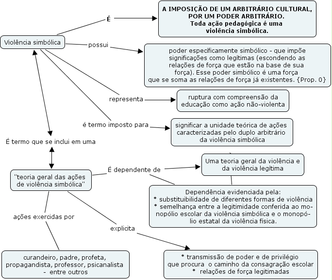 Violência Simbólica, Uma teoria geral da violência e da violência legítima Dependência evidenciada pela: * substituibilidade de diferentes formas de violência * semelhança entre a legitimidade conferida ao mo- nopólio escolar da violência simbólica e o monopó- lio estatal da violência física., Violência simbólica representa ruptura com compreensão da educação como ação não-violenta, "teoria geral das ações de violência simbólica" ações exercidas por curandeiro, padre, profeta, propagandista, professor, psicanalista - entre outros, Violência simbólica é termo imposto para significar a unidade teórica de ações caracterizadas pelo duplo arbitrário da violência simbólica, Violência simbólica possui poder específicamente simbólico - que impõe significações como legítimas (escondendo as relações de força que estão na base de sua força). Esse poder simbólico é uma força que se soma as relações de força já existentes. {Prop. 0}, Violência simbólica É A IMPOSIÇÃO DE UM ARBITR�?RIO CULTURAL, POR UM PODER ARBITR�?RIO. Toda ação pedagógica é uma violência simbólica., "teoria geral das ações de violência simbólica" explicita * transmissão de poder e de privilégio que procura o caminho da consagração escolar * relações de força legitimadas, "teoria geral das ações de violência simbólica" É dependente de Uma teoria geral da violência e da violência legítima, Violência simbólica É termo que se inclui em uma "teoria geral das ações de violência simbólica", "teoria geral das ações de violência simbólica" É dependente de Dependência evidenciada pela: * substituibilidade de diferentes formas de violência * semelhança entre a legitimidade conferida ao mo- nopólio escolar da violência simbólica e o monopó- lio estatal da violência física.