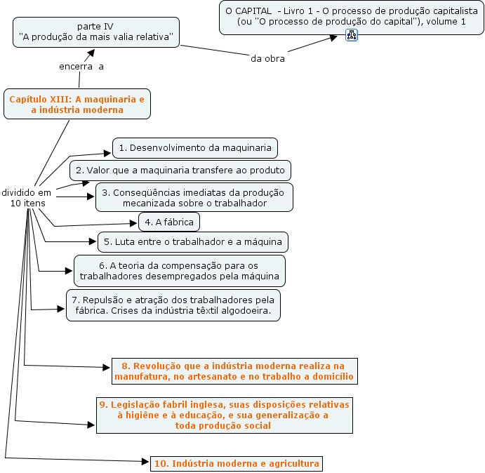 O Capital - A maquinaria e a indústria moderna, parte IV "A produção da mais valia relativa" da obra O CAPITAL - Livro 1 - O processo de produção capitalista (ou "O processo de produção do capital"), volume 1, Capítulo XIII: A maquinaria e a indústria moderna dividido em 10 itens 2. Valor que a maquinaria transfere ao produto, Capítulo XIII: A maquinaria e a indústria moderna dividido em 10 itens 3. Conseqüências imediatas da produção mecanizada sobre o trabalhador, Capítulo XIII: A maquinaria e a indústria moderna dividido em 10 itens 4. A fábrica, Capítulo XIII: A maquinaria e a indústria moderna dividido em 10 itens 5. Luta entre o trabalhador e a máquina, Capítulo XIII: A maquinaria e a indústria moderna dividido em 10 itens 6. A teoria da compensação para os trabalhadores desempregados pela máquina, Capítulo XIII: A maquinaria e a indústria moderna dividido em 10 itens 7. Repulsão e atração dos trabalhadores pela fábrica. Crises da indústria têxtil algodoeira., Capítulo XIII: A maquinaria e a indústria moderna dividido em 10 itens 10. Indústria moderna e agricultura, Capítulo XIII: A maquinaria e a indústria moderna dividido em 10 itens 1. Desenvolvimento da maquinaria, Capítulo XIII: A maquinaria e a indústria moderna dividido em 10 itens 8. Revolução que a indústria moderna realiza na manufatura, no artesanato e no trabalho a domicílio