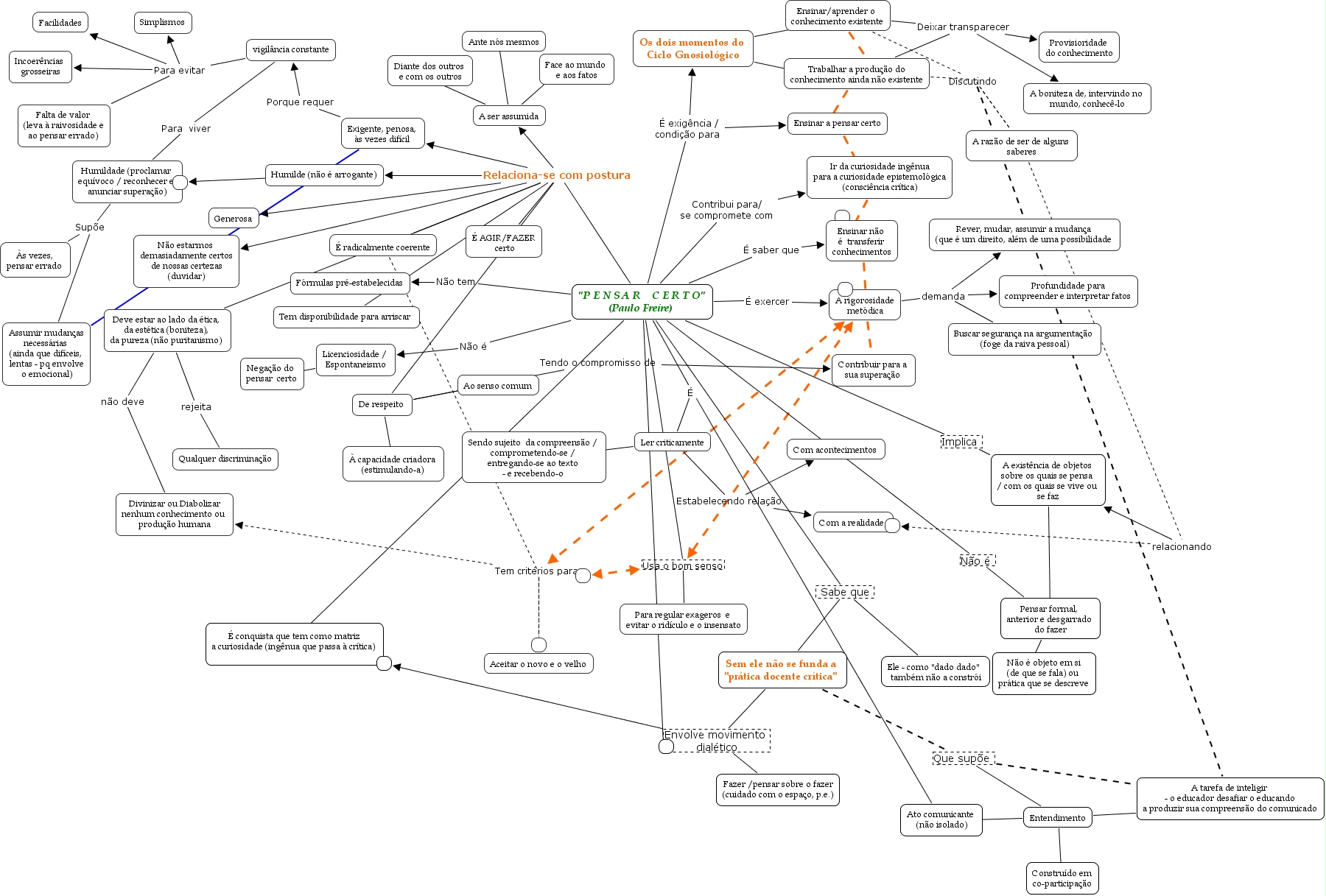 Pensar certo, A razão de ser de alguns saberes relacionando , A rigorosidade metódica Usa o bom senso Para regular exageros e evitar o ridículo e o insensato, "P E N S A R C E R T O" (Paulo Freire) É Ato comunicante (não isolado), vigilância constante Para evitar Falta de valor (leva à raivosidade e ao pensar errado), Ler criticamente ???? Sendo sujeito da compreensão / comprometendo-se / entregando-se ao texto - e recebendo-o, "P E N S A R C E R T O" (Paulo Freire) É exigência / condição para Os dois momentos do Ciclo Gnosiológico, Ensinar a pensar certo ???? Ir da curiosidade ingênua para a curiosidade epistemológica (consciência crítica), A rigorosidade metódica demanda Profundidade para compreender e interpretar fatos, Humilde (não é arrogante) ???? , Ir da curiosidade ingênua para a curiosidade epistemológica (consciência crítica) ????