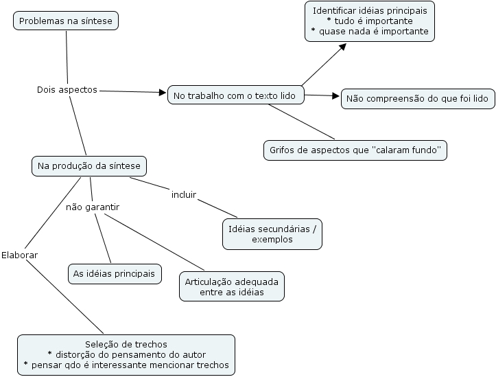 Primeiras Palavras - Problemas identificados, No trabalho com o texto lido ???? Não compreensão do que foi lido, Problemas na síntese Dois aspectos Na produção da síntese, Na produção da síntese não garantir As idéias principais, Na produção da síntese não garantir Articulação adequada entre as idéias, Na produção da síntese incluir Idéias secundárias / exemplos, No trabalho com o texto lido Identificar idéias principais * tudo é importante * quase nada é importante, Problemas na síntese Dois aspectos No trabalho com o texto lido, Na produção da síntese Elaborar Seleção de trechos * distorção do pensamento do autor * pensar qdo é interessante mencionar trechos, No trabalho com o texto lido ???? Grifos de aspectos que "calaram fundo"