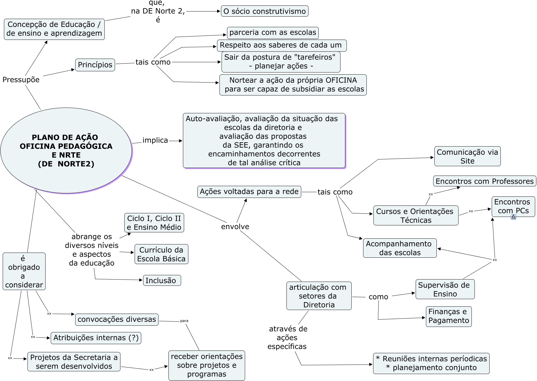 Plano Oficina Pedagógica (sugestão), PLANO DE AÇÃO OFICINA PEDAGÓGICA E NRTE (DE NORTE2) envolve Ações voltadas para a rede, Supervisão de Ensino xx Encontros com PCs, PLANO DE AÇÃO OFICINA PEDAGÓGICA E NRTE (DE NORTE2) Pressupõe Princípios, Cursos e Orientações Técnicas xx Encontros com PCs, Cursos e Orientações Técnicas xx Encontros com Professores, Supervisão de Ensino xx Acompanhamento das escolas, é obrigado a considerar xx Atribuições internas (?), PLANO DE AÇÃO OFICINA PEDAGÓGICA E NRTE (DE NORTE2) implica Auto-avaliação, avaliação da situação das escolas da diretoria e avaliação das propostas da SEE, garantindo os encaminhamentos decorrentes de tal análise crítica, é obrigado a considerar xx Projetos da Secretaria a serem desenvolvidos, articulação com setores da Diretoria como Finanças e Pagamento