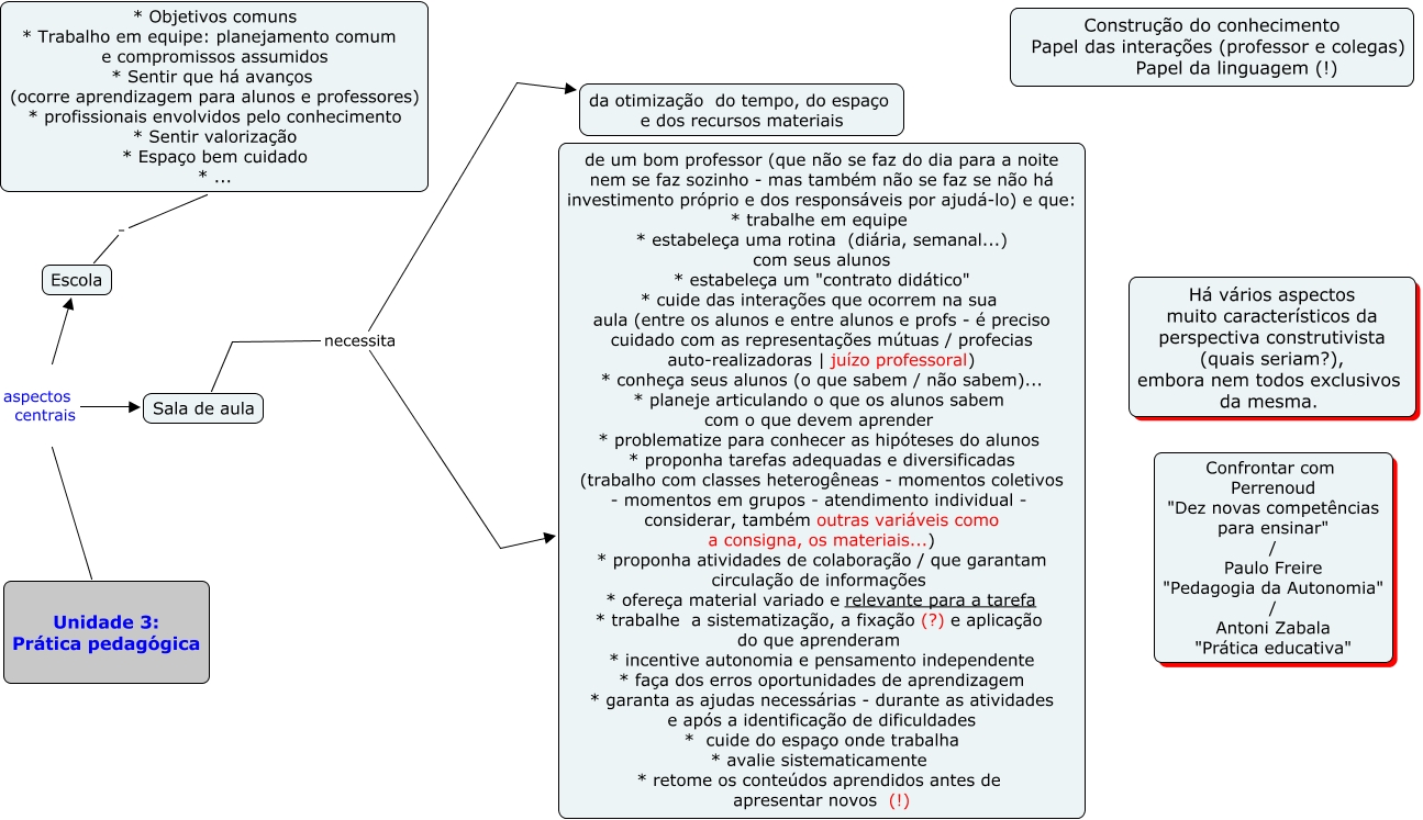Unidade 3 (Prática pedagógica), Unidade 3: Prática pedagógica aspectos centrais Escola, Sala de aula necessita de um bom professor (que não se faz do dia para a noite nem se faz sozinho - mas também não se faz se não há investimento próprio e dos responsáveis por ajudá-lo) e que: * trabalhe em equipe * estabeleça uma rotina (diária, semanal...) com seus alunos * estabeleça um "contrato didático" * cuide das interações que ocorrem na sua aula (entre os alunos e entre alunos e profs - é preciso cuidado com as representações mútuas / profecias auto-realizadoras | juízo professoral) * conheça seus alunos (o que sabem / não sabem)... * planeje articulando o que os alunos sabem com o que devem aprender * problematize para conhecer as hipóteses do alunos * proponha tarefas adequadas e diversificadas (trabalho com classes heterogêneas - momentos coletivos - momentos em grupos - atendimento individual - considerar, também outras variáveis como a consigna, os materiais...) * proponha atividades de colaboração / que garantam circulação de informações * ofereça material variado e relevante para a tarefa * trabalhe a sistematização, a fixação (?) e aplicação do que aprenderam * incentive autonomia e pensamento independente * faça dos erros oportunidades de aprendizagem * garanta as ajudas necessárias - durante as atividades e após a identificação de dificuldades * cuide do espaço onde trabalha * avalie sistematicamente * retome os conteúdos aprendidos antes de apresentar novos (!), * Objetivos comuns * Trabalho em equipe: planejamento comum e compromissos assumidos * Sentir que há avanços (ocorre aprendizagem para alunos e professores) * profissionais envolvidos pelo conhecimento * Sentir valorização * Espaço bem cuidado * ... . Escola, Sala de aula necessita da otimização do tempo, do espaço e dos recursos materiais, Unidade 3: Prática pedagógica aspectos centrais Sala de aula