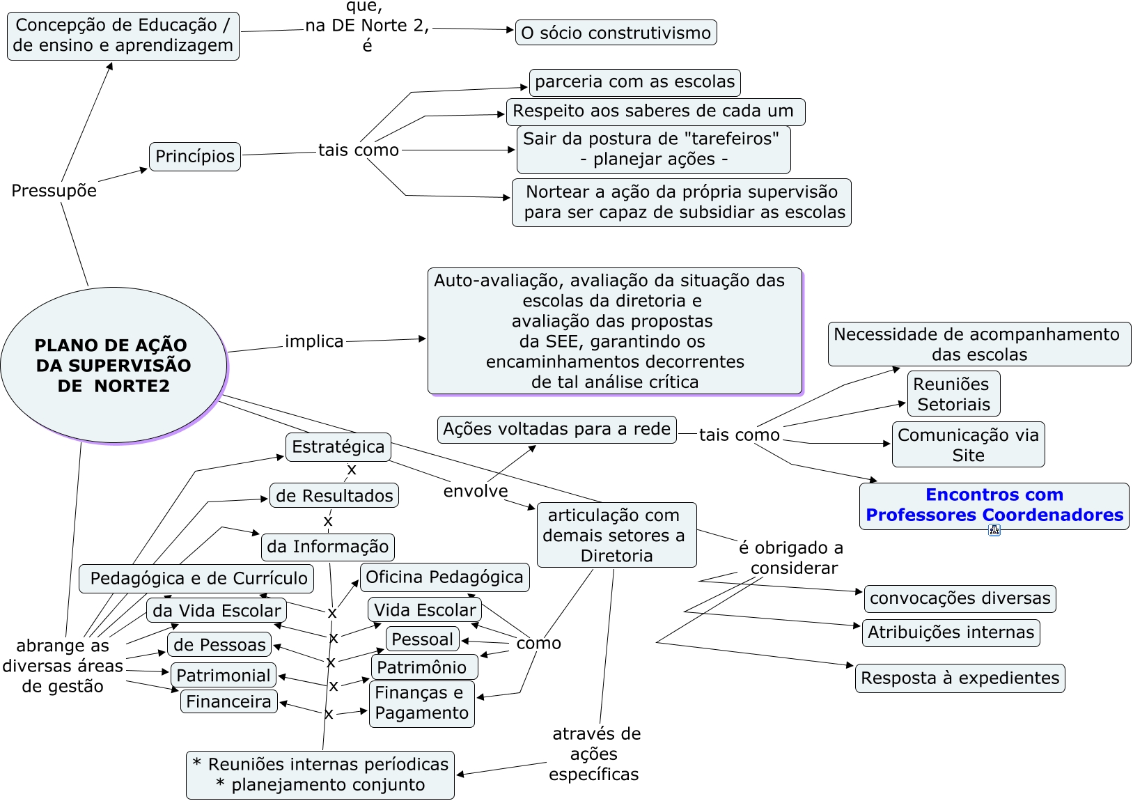 Plano da Supervisão, articulação com demais setores a Diretoria como Finanças e Pagamento, Estratégica x de Resultados, PLANO DE AÇÃO DA SUPERVISÃO DE NORTE2 abrange as diversas áreas de gestão Estratégica, articulação com demais setores a Diretoria como Patrimônio, articulação com demais setores a Diretoria como Oficina Pedagógica, PLANO DE AÇÃO DA SUPERVISÃO DE NORTE2 Pressupõe Concepção de Educação / de ensino e aprendizagem, Ações voltadas para a rede tais como Reuniões Setoriais, PLANO DE AÇÃO DA SUPERVISÃO DE NORTE2 implica Auto-avaliação, avaliação da situação das escolas da diretoria e avaliação das propostas da SEE, garantindo os encaminhamentos decorrentes de tal análise crítica, PLANO DE AÇÃO DA SUPERVISÃO DE NORTE2 é obrigado a considerar Resposta à expedientes, PLANO DE AÇÃO DA SUPERVISÃO DE NORTE2 abrange as diversas áreas de gestão da Vida Escolar