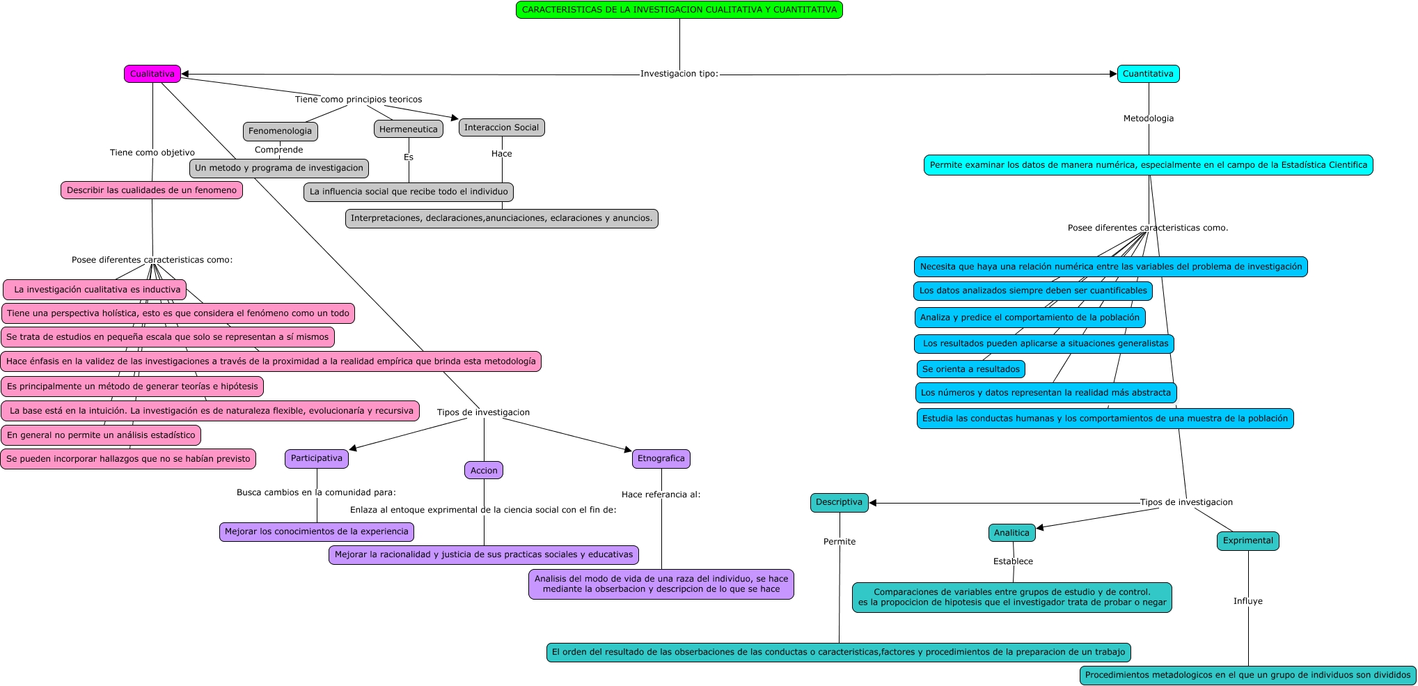Este Cmap, tiene información relacionada con: sistemas de trasporte cualitatio y cuantitativo, Describir las cualidades de un fenomeno Posee diferentes caracteristicas como: En general no permite un análisis estadístico, Cualitativa Tiene como principios teoricos Hermeneutica, Permite examinar los datos de manera numérica, especialmente en el campo de la Estadística Cientifica Posee diferentes caracteristicas como. Los datos analizados siempre deben ser cuantificables, Exprimental Influye Procedimientos metadologicos en el que un grupo de individuos son divididos, Permite examinar los datos de manera numérica, especialmente en el campo de la Estadística Cientifica Tipos de investigacion Exprimental, Etnografica Hace referancia al: Analisis del modo de vida de una raza del individuo, se hace mediante la obserbacion y descripcion de lo que se hace, Cualitativa Tipos de investigacion Participativa, Permite examinar los datos de manera numérica, especialmente en el campo de la Estadística Cientifica Posee diferentes caracteristicas como. Estudia las conductas humanas y los comportamientos de una muestra de la población, Permite examinar los datos de manera numérica, especialmente en el campo de la Estadística Cientifica Posee diferentes caracteristicas como. Los resultados pueden aplicarse a situaciones generalistas, CARACTERISTICAS DE LA INVESTIGACION CUALITATIVA Y CUANTITATIVA Investigacion tipo: Cuantitativa, Cualitativa Tipos de investigacion Accion, Descriptiva Permite El orden del resultado de las obserbaciones de las conductas o caracteristicas,factores y procedimientos de la preparacion de un trabajo, Accion Enlaza al entoque exprimental de la ciencia social con el fin de: Mejorar la racionalidad y justicia de sus practicas sociales y educativas, Permite examinar los datos de manera numérica, especialmente en el campo de la Estadística Cientifica Posee diferentes caracteristicas como. Necesita que haya una relación numérica entre las variables del problema de investigación, Describir las cualidades de un fenomeno Posee diferentes caracteristicas como: La investigación cualitativa es inductiva, Describir las cualidades de un fenomeno Posee diferentes caracteristicas como: La base está en la intuición. La investigación es de naturaleza flexible, evolucionaría y recursiva, Describir las cualidades de un fenomeno Posee diferentes caracteristicas como: Tiene una perspectiva holística, esto es que considera el fenómeno como un todo, Permite examinar los datos de manera numérica, especialmente en el campo de la Estadística Cientifica Tipos de investigacion Analitica, Hermeneutica Es La influencia social que recibe todo el individuo, CARACTERISTICAS DE LA INVESTIGACION CUALITATIVA Y CUANTITATIVA Investigacion tipo: Cualitativa