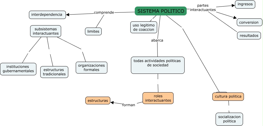 Este Cmap, tiene información relacionada con: sistema politico, SISTEMA POLITICO uso legitimo de coaccion, roles interactuantes forman estructuras, SISTEMA POLITICO comprende interdependencia, SISTEMA POLITICO ????, limites comprende interdependencia, subsistemas interactuantes estructuras tradicionales, SISTEMA POLITICO partes interactuantes ingresos, subsistemas interactuantes instituciones gubernamentales, todas actividades politicas de sociedad roles interactuantes, SISTEMA POLITICO partes interactuantes resultados, SISTEMA POLITICO partes interactuantes conversion, cultura politica socializacion politica, SISTEMA POLITICO abarca todas actividades politicas de sociedad, subsistemas interactuantes ????