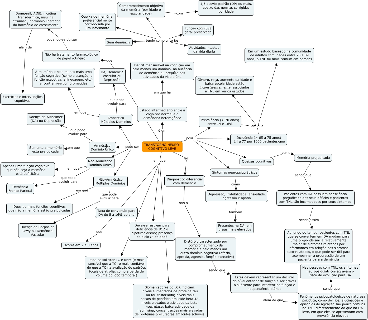 Esse mapa conceitual, produzido no IHMC CmapTools, tem a informação relacionada a: Transtorno Neurocognitivo Leve, Incidência (> 65 a 75 anos) 14 a 77 por 1000 pacientes-ano em que Gênero, raça, aumento da idade e baixa escolaridade estão inconsistentemente associados à TNL em vários estudos, Déficit mensurável na cognição em pelo menos um domínio, na ausência de demência ou prejuízo nas atividades da vida diária tendo como critérios Queixa de memória, preferencialmente corroborada por um informante, Déficit mensurável na cognição em pelo menos um domínio, na ausência de demência ou prejuízo nas atividades da vida diária tendo como critérios Sem demência, TRANSTORNO NEURO- COGNITIVO LEVE possui Incidência (> 65 a 75 anos) 14 a 77 por 1000 pacientes-ano, Memória prejudicada sendo que Pacientes com DA possuem consciência prejudicada dos seus déficits e pacientes com TNL são incomodados por seus sintomas, Não-Amnéstico Múltiplos Domínios que pode evoluir para Doença de Corpos de Lewy ou Demência Vascular, Pacientes com DA possuem consciência prejudicada dos seus déficits e pacientes com TNL são incomodados por seus sintomas sendo assim Ao longo do tempo, pacientes com TNL que se convertem em DA mudam para uma preponderância relativamente maior de sintomas relatados por informantes em relação aos sintomas auto-relatados, o que pode ser útil para acompanhar a progressão de um paciente para a demência, TRANSTORNO NEURO- COGNITIVO LEVE possui Prevalência (> 70 anos) entre 14 e 18%, Não-Amnéstico Domínio Único que pode evoluir para Demência Fronto-Parietal, TRANSTORNO NEURO- COGNITIVO LEVE em que Deve-se rastrear para deficiência de B12 e hipotireoidismo; presença de alelo ε4 da apoE, Sintomas neuropsiquiátricos como Depressão, irritabilidade, ansiedade, agressão e apatia, TRANSTORNO NEURO- COGNITIVO LEVE possui Queixas cognitivas, TRANSTORNO NEURO- COGNITIVO LEVE pode ser Amnéstico Múltiplos Domínios, Queixas cognitivas como Memória prejudicada, TRANSTORNO NEURO- COGNITIVO LEVE pode ser Não-Amnéstico Domínio Único, Distúrbio caracterizado por comprometimento da memória e pelo menos um outro domínio cognitivo (afasia, apraxia, agnosia, função executiva) sendo que Estes devem representar um declínio do nível anterior de função e ser graves o suficiente para interferir na função e independência diárias, TRANSTORNO NEURO- COGNITIVO LEVE em que Taxa de conversão para DA de 5 a 16% ao ano, Déficit mensurável na cognição em pelo menos um domínio, na ausência de demência ou prejuízo nas atividades da vida diária tendo como critérios Atividades intactas da vida diária, Prevalência (> 70 anos) entre 14 e 18% em que Em um estudo baseado na comunidade de adultos com idades entre 70 e 89 anos, o TNL foi mais comum em homens, TRANSTORNO NEURO- COGNITIVO LEVE que Não há tratamento farmacológico de papel rotineiro