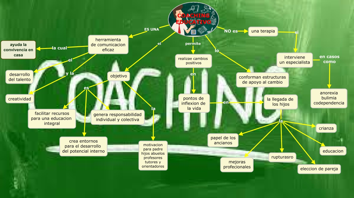 Este Cmap, tiene información relacionada con: coaching, objetivo es crea entornos para el desarrollo del potencial interno, la llegada de los hijos la crianza, herramienta de comunicacion eficaz y la creatividad, herramienta de comunicacion eficaz la cual ayuda la convivencia en casa, la llegada de los hijos la rupturasro, interviene un especialista en casos como anorexia bulimia codependencia, una terapia si interviene un especialista, objetivo la motivacion para padre hijos abuelos profesores tutores y orientadores, la llegada de los hijos la educacion, la llegada de los hijos la mejoras profecionales, COACHING EDUCATIVO ES UNA herramienta de comunicacion eficaz, pontos de inflexion de la vida en la llegada de los hijos, la llegada de los hijos la eleccion de pareja, COACHING EDUCATIVO lo conforman estructuras de apoyo al cambio, objetivo es genera responsabilidad individual y colectiva, COACHING EDUCATIVO NO es una terapia, herramienta de comunicacion eficaz el desarrollo del talento, COACHING EDUCATIVO permite realizae cambios positivos, COACHING EDUCATIVO el objetivo, la llegada de los hijos la papel de los ancianos