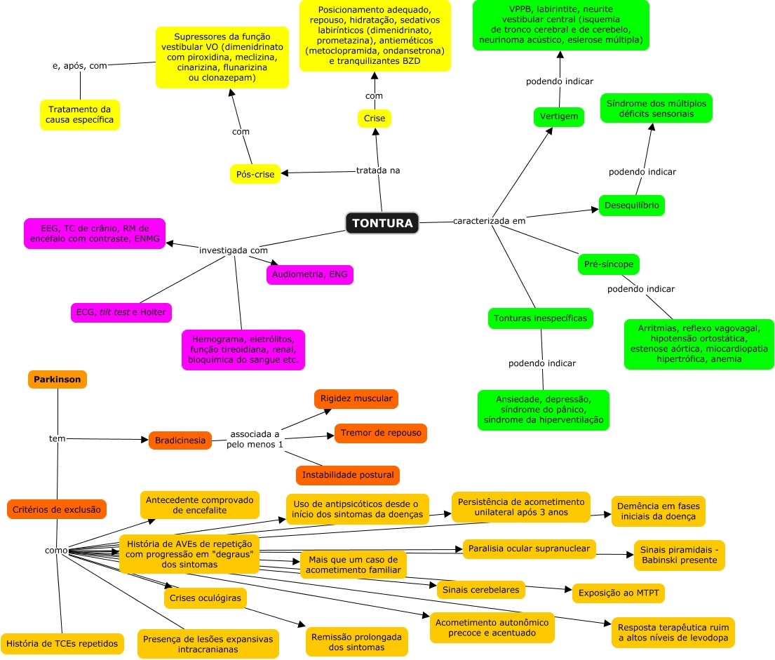 Esse mapa conceitual, produzido no IHMC CmapTools, tem a informação relacionada a: Tontura - 2º caso, TONTURA caracterizada em Tonturas inespecíficas, Parkinson tem Critérios de exclusão, Bradicinesia associada a pelo menos 1 Tremor de repouso, Critérios de exclusão como Exposição ao MTPT, TONTURA caracterizada em Desequilíbrio, Critérios de exclusão como Paralisia ocular supranuclear, Pré-síncope podendo indicar Arritmias, reflexo vagovagal, hipotensão ortostática, estenose aórtica, miocardiopatia hipertrófica, anemia, TONTURA investigada com EEG, TC de crânio, RM de encéfalo com contraste, ENMG, Bradicinesia associada a pelo menos 1 Instabilidade postural, Desequilíbrio podendo indicar Síndrome dos múltiplos déficits sensoriais, TONTURA tratada na Crise, Vertigem podendo indicar VPPB, labirintite, neurite vestibular central (isquemia de tronco cerebral e de cerebelo, neurinoma acústico, eslerose múltipla), Bradicinesia associada a pelo menos 1 Rigidez muscular, TONTURA investigada com Audiometria, ENG, TONTURA investigada com Hemograma, eletrólitos, função tireoidiana, renal, bioquímica do sangue etc., Critérios de exclusão como Mais que um caso de acometimento familiar, Critérios de exclusão como Demência em fases iniciais da doença, Critérios de exclusão como Uso de antipsicóticos desde o início dos sintomas da doenças, Pós-crise com Supressores da função vestibular VO (dimenidrinato com piroxidina, meclizina, cinarizina, flunarizina ou clonazepam), Critérios de exclusão como Sinais piramidais - Babinski presente