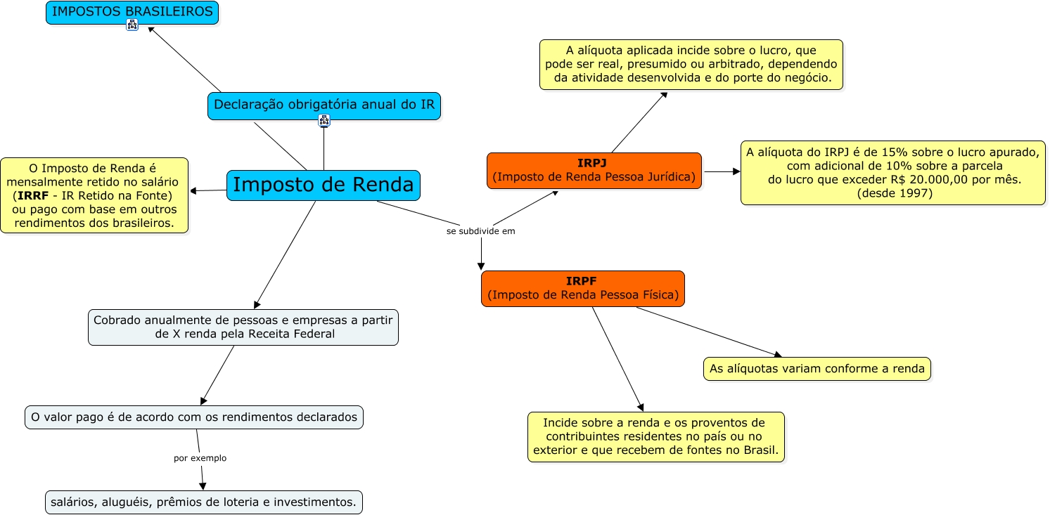 Esse mapa conceitual, produzido no IHMC CmapTools, tem a informação relacionada a: IR - Imposto de Renda, Imposto de Renda se subdivide em IRPJ (Imposto de Renda Pessoa Jurídica), IRPJ (Imposto de Renda Pessoa Jurídica) A alíquota aplicada incide sobre o lucro, que pode ser real, presumido ou arbitrado, dependendo da atividade desenvolvida e do porte do negócio., Imposto de Renda se subdivide em IRPF (Imposto de Renda Pessoa Física), Imposto de Renda IMPOSTOS BRASILEIROS, Imposto de Renda Declaração obrigatória anual do IR, O valor pago é de acordo com os rendimentos declarados por exemplo salários, aluguéis, prêmios de loteria e investimentos., Imposto de Renda O Imposto de Renda é mensalmente retido no salário (IRRF - IR Retido na Fonte) ou pago com base em outros rendimentos dos brasileiros., Cobrado anualmente de pessoas e empresas a partir de X renda pela Receita Federal O valor pago é de acordo com os rendimentos declarados, IRPF (Imposto de Renda Pessoa Física) As alíquotas variam conforme a renda, Imposto de Renda Cobrado anualmente de pessoas e empresas a partir de X renda pela Receita Federal, IRPJ (Imposto de Renda Pessoa Jurídica) A alíquota do IRPJ é de 15% sobre o lucro apurado, com adicional de 10% sobre a parcela do lucro que exceder R$ 20.000,00 por mês. (desde 1997), IRPF (Imposto de Renda Pessoa Física) Incide sobre a renda e os proventos de contribuintes residentes no país ou no exterior e que recebem de fontes no Brasil.