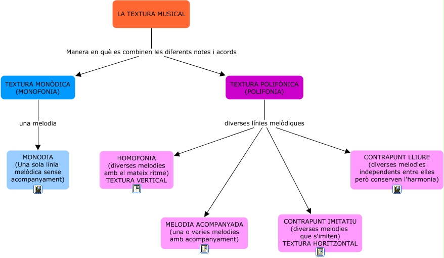 Este Cmap, tiene información relacionada con: Textura musical, TEXTURA POLIFÒNICA (POLIFONIA) diverses línies melòdiques HOMOFONIA (diverses melodies amb el mateix ritme) TEXTURA VERTICAL, TEXTURA POLIFÒNICA (POLIFONIA) diverses línies melòdiques CONTRAPUNT LLIURE (diverses melodies independents entre elles però conserven l'harmonia), TEXTURA MONÒDICA (MONOFONIA) una melodia MONODIA (Una sola línia melòdica sense acompanyament), LA TEXTURA MUSICAL Manera en què es combinen les diferents notes i acords TEXTURA MONÒDICA (MONOFONIA), LA TEXTURA MUSICAL Manera en què es combinen les diferents notes i acords TEXTURA POLIFÒNICA (POLIFONIA), TEXTURA POLIFÒNICA (POLIFONIA) diverses línies melòdiques CONTRAPUNT IMITATIU (diverses melodies que s'imiten) TEXTURA HORITZONTAL, TEXTURA POLIFÒNICA (POLIFONIA) diverses línies melòdiques MELODIA ACOMPANYADA (una o varies melodies amb acompanyament)