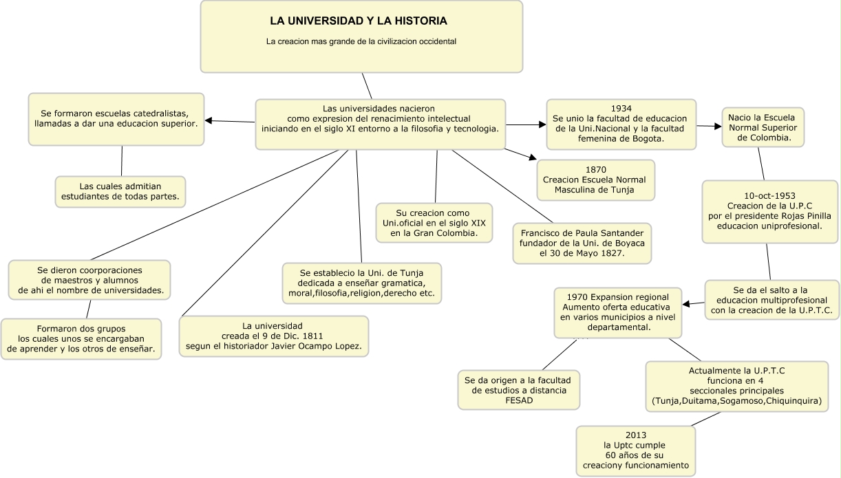 Este Cmap, tiene información relacionada con: Historia de la u, 1970 Expansion regional Aumento oferta educativa en varios municipios a nivel departamental. ???? Se da origen a la facultad de estudios a distancia FESAD, 1934 Se unio la facultad de educacion de la Uni.Nacional y la facultad femenina de Bogota. ???? Nacio la Escuela Normal Superior de Colombia., 1970 Expansion regional Aumento oferta educativa en varios municipios a nivel departamental. ???? Actualmente la U.P.T.C funciona en 4 seccionales principales (Tunja,Duitama,Sogamoso,Chiquinquira), LA UNIVERSIDAD Y LA HISTORIA La creacion mas grande de la civilizacion occidental ???? Las universidades nacieron como expresion del renacimiento intelectual iniciando en el siglo XI entorno a la filosofia y tecnologia., Las universidades nacieron como expresion del renacimiento intelectual iniciando en el siglo XI entorno a la filosofia y tecnologia. ???? Se formaron escuelas catedralistas, llamadas a dar una educacion superior., Las universidades nacieron como expresion del renacimiento intelectual iniciando en el siglo XI entorno a la filosofia y tecnologia. ???? Su creacion como Uni.oficial en el siglo XIX en la Gran Colombia., Las universidades nacieron como expresion del renacimiento intelectual iniciando en el siglo XI entorno a la filosofia y tecnologia. ???? Francisco de Paula Santander fundador de la Uni. de Boyaca el 30 de Mayo 1827., Se formaron escuelas catedralistas, llamadas a dar una educacion superior. ???? Las cuales admitian estudiantes de todas partes., Las universidades nacieron como expresion del renacimiento intelectual iniciando en el siglo XI entorno a la filosofia y tecnologia. ???? 1934 Se unio la facultad de educacion de la Uni.Nacional y la facultad femenina de Bogota., Las universidades nacieron como expresion del renacimiento intelectual iniciando en el siglo XI entorno a la filosofia y tecnologia. ???? Se dieron coorporaciones de maestros y alumnos de ahi el nombre de universidades., Actualmente la U.P.T.C funciona en 4 seccionales principales (Tunja,Duitama,Sogamoso,Chiquinquira) ???? 2013 la Uptc cumple 60 años de su creaciony funcionamiento, Las universidades nacieron como expresion del renacimiento intelectual iniciando en el siglo XI entorno a la filosofia y tecnologia. ???? La universidad creada el 9 de Dic. 1811 segun el historiador Javier Ocampo Lopez., 10-oct-1953 Creacion de la U.P.C por el presidente Rojas Pinilla educacion uniprofesional. ???? Se da el salto a la educacion multiprofesional con la creacion de la U.P.T.C., Las universidades nacieron como expresion del renacimiento intelectual iniciando en el siglo XI entorno a la filosofia y tecnologia. ???? Se establecio la Uni. de Tunja dedicada a enseñar gramatica, moral,filosofia,religion,derecho etc., Las universidades nacieron como expresion del renacimiento intelectual iniciando en el siglo XI entorno a la filosofia y tecnologia. ???? 1870 Creacion Escuela Normal Masculina de Tunja, Se da el salto a la educacion multiprofesional con la creacion de la U.P.T.C. ???? 1970 Expansion regional Aumento oferta educativa en varios municipios a nivel departamental., Se dieron coorporaciones de maestros y alumnos de ahi el nombre de universidades. ???? Formaron dos grupos los cuales unos se encargaban de aprender y los otros de enseñar., Nacio la Escuela Normal Superior de Colombia. ???? 10-oct-1953 Creacion de la U.P.C por el presidente Rojas Pinilla educacion uniprofesional.