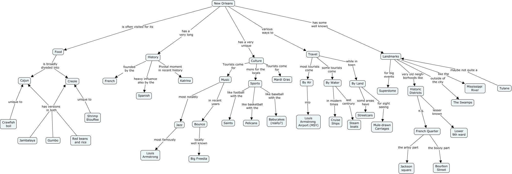 This Concept Map, created with IHMC CmapTools, has information related to: IAMSE Focus session 2019-5, Gumbo has versions in both Creole, Travel some tourists come By Water, New Orleans is often visited for its Food, Red beans and rice has versions in both Cajun, Landmarks outside of the city The Swamps, Shrimp Etouffee unique to Creole, French Quarter the artsy part Jackson square, Food is broadly diveded into Cajun, By Water last centrury Steam boats, Gumbo has versions in both Cajun, Food is broadly diveded into Creole, Sports like football with the Saints, Landmarks like the Mississippi River, Culture more for the locals Sports, Travel while in town By Land, Culture Tourists come for Music, Red beans and rice has versions in both Creole, Landmarks for big events Superdome, New Orleans has a very long History, By Water in modern times Cruise Ships
