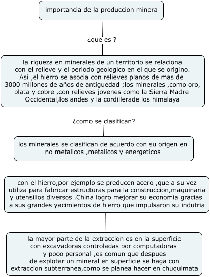 Este Cmap, tiene información relacionada con: produccion minera, importancia de la produccion minera ¿que es ? la riqueza en minerales de un territorio se relaciona con el relieve y el periodo geologico en el que se origino. Asi ,el hierro se asocia con relieves planos de mas de 3000 millones de años de antiguedad ;los minerales ,como oro, plata y cobre ,con relieves jovenes como la Sierra Madre Occidental,los andes y la cordillerade los himalaya, la riqueza en minerales de un territorio se relaciona con el relieve y el periodo geologico en el que se origino. Asi ,el hierro se asocia con relieves planos de mas de 3000 millones de años de antiguedad ;los minerales ,como oro, plata y cobre ,con relieves jovenes como la Sierra Madre Occidental,los andes y la cordillerade los himalaya ¿como se clasifican? los minerales se clasifican de acuerdo con su origen en no metalicos ,metalicos y energeticos, con el hierro,por ejemplo se preducen acero ,que a su vez utiliza para fabricar estructuras para la construccion,maquinaria y utensilios diversos .China logro mejorar su economia gracias a sus grandes yacimientos de hierro que impulsaron su indutria la mayor parte de la extraccion es en la superficie con excavadoras controladas por computadoras y poco personal ,es comun que despues de explotar un mineral en superficie se haga con extraccion subterranea,como se planea hacer en chuquimata, los minerales se clasifican de acuerdo con su origen en no metalicos ,metalicos y energeticos ???? con el hierro,por ejemplo se preducen acero ,que a su vez utiliza para fabricar estructuras para la construccion,maquinaria y utensilios diversos .China logro mejorar su economia gracias a sus grandes yacimientos de hierro que impulsaron su indutria
