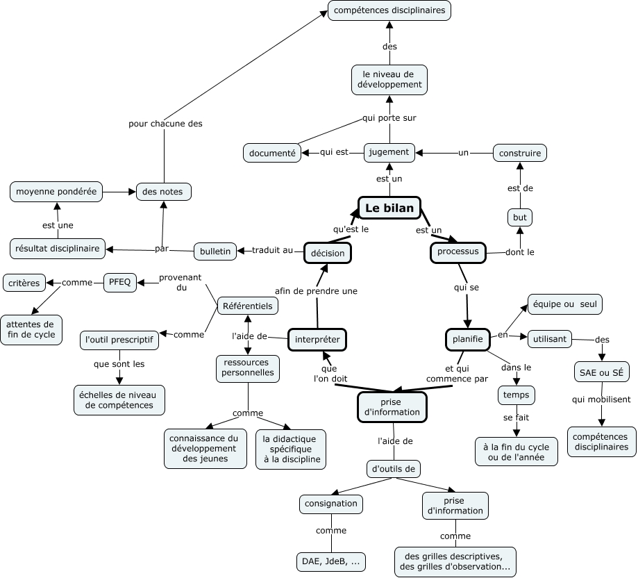 Cette carte de concepts créée avec IHMC CmapTools traite de: Le bilan, utilisant des SAE ou SÉ, d'outils de consignation, PFEQ comme attentes de fin de cycle, moyenne pondérée des notes, planifie en équipe ou seul, des notes pour chacune des compétences disciplinaires, ressources personnelles comme connaissance du développement des jeunes, jugement qui est documenté, jugement qui porte sur le niveau de développement, prise d'information comme des grilles descriptives, des grilles d'observation..., temps se fait à la fin du cycle ou de l'année, construire un jugement, prise d'information l'aide de d'outils de, consignation comme DAE, JdeB, ..., bulletin par résultat disciplinaire, décision qu'est le Le bilan, planifie dans le temps, processus dont le but, interpréter l'aide de Référentiels, SAE ou SÉ qui mobilisent compétences disciplinaires