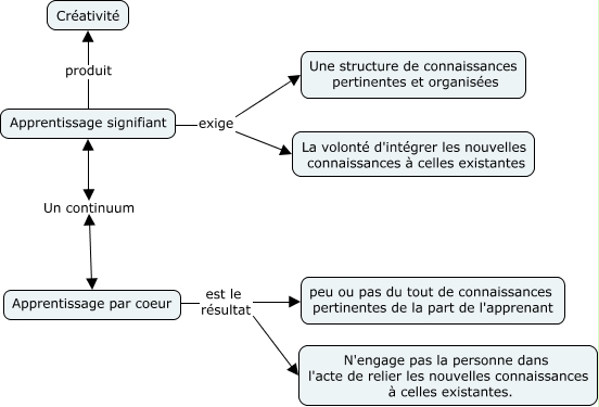 Cette carte de concepts créée avec IHMC CmapTools traite de: continuum apprentissage signifiant et par coeur, Apprentissage par coeur est le résultat peu ou pas du tout de connaissances pertinentes de la part de l'apprenant, Apprentissage signifiant exige Une structure de connaissances pertinentes et organisées, Apprentissage signifiant exige La volonté d'intégrer les nouvelles connaissances à celles existantes, Apprentissage par coeur est le résultat N'engage pas la personne dans l'acte de relier les nouvelles connaissances à celles existantes., Apprentissage signifiant Un continuum Apprentissage par coeur