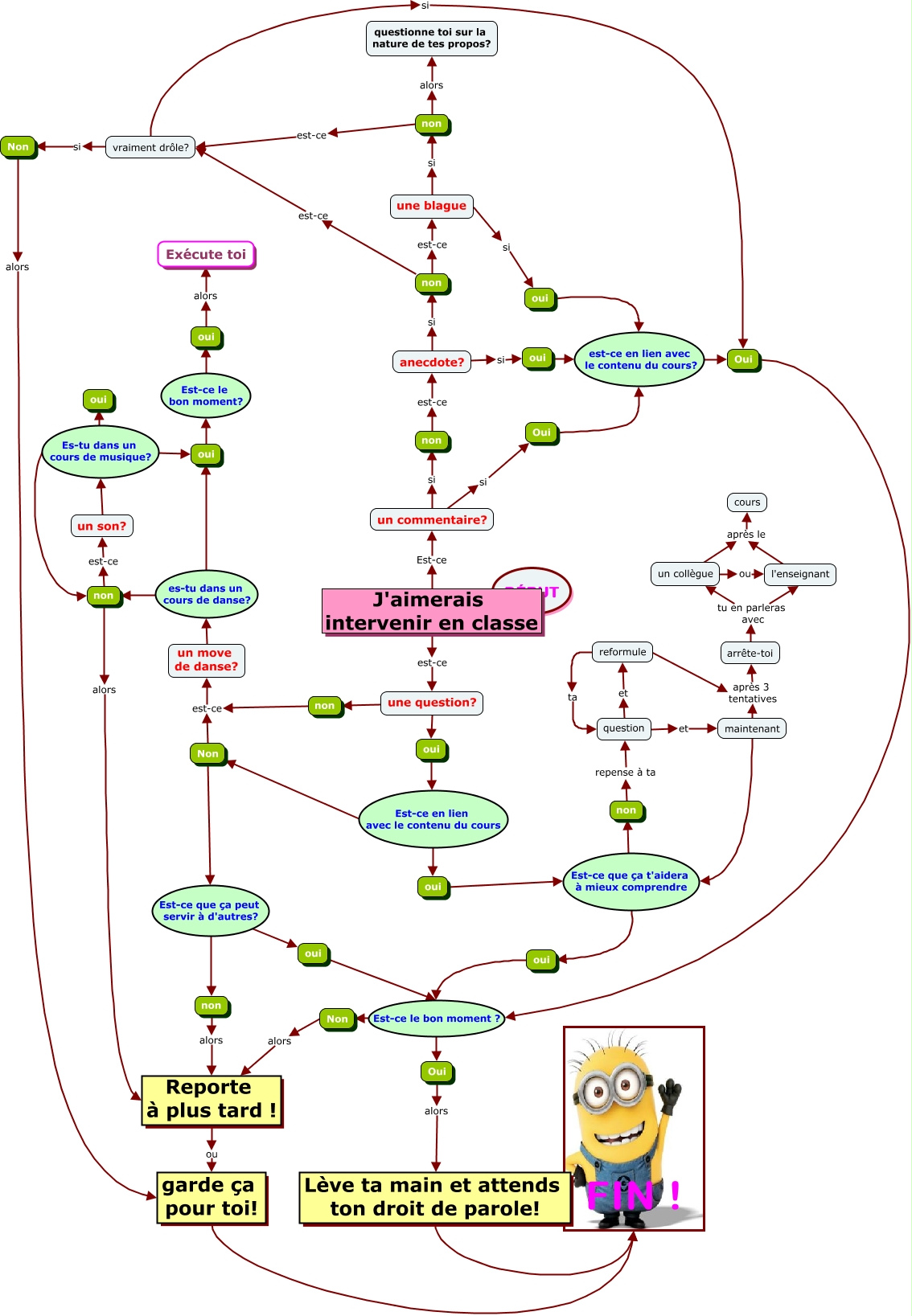 Cette carte de concepts créée avec IHMC CmapTools traite de: Intervenir en classe, oui Est-ce le bon moment ? Oui, oui Est-ce le bon moment? oui, une question? oui, non alors Reporte à plus tard !, J'aimerais intervenir en classe est-ce une question?, non alors Reporte à plus tard !, oui Est-ce en lien avec le contenu du cours oui, non est-ce un son?, Non Est-ce que ça peut servir à d'autres? oui, non est-ce anecdote?, Reporte à plus tard ! ou garde ça pour toi!, un collègue ou l'enseignant, non alors questionne toi sur la nature de tes propos?, J'aimerais intervenir en classe Est-ce un commentaire?, Non alors garde ça pour toi!, reformule ta question, un collègue après le cours, Non est-ce un move de danse?, une blague si non, vraiment drôle? si Oui