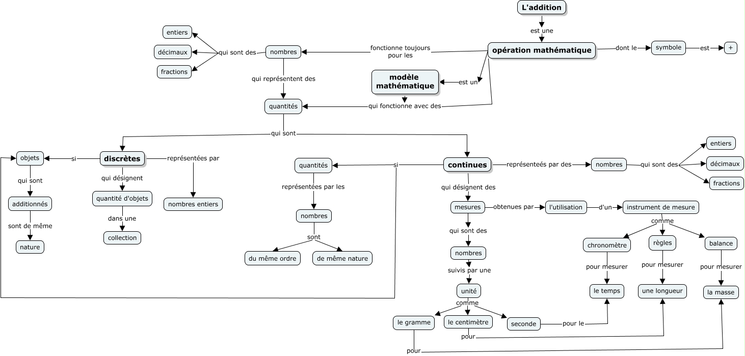 Cette carte de concepts créée avec IHMC CmapTools traite de: L_addition, nombres sont de même nature, quantités qui sont continues, mesures qui sont des nombres, discrètes représentées par nombres entiers, seconde pour le le temps, symbole est +, continues si quantités, quantités qui sont discrètes, unité comme seconde, règles pour mesurer une longueur, opération mathématique fonctionne toujours pour les nombres, quantités représentées par les nombres, additionnés sont de même nature, continues représenteés par des nombres, instrument de mesure comme règles, instrument de mesure comme balance, modèle mathématique qui fonctionne avec des quantités, nombres qui sont des fractions, opération mathématique dont le symbole, nombres qui représentent des quantités