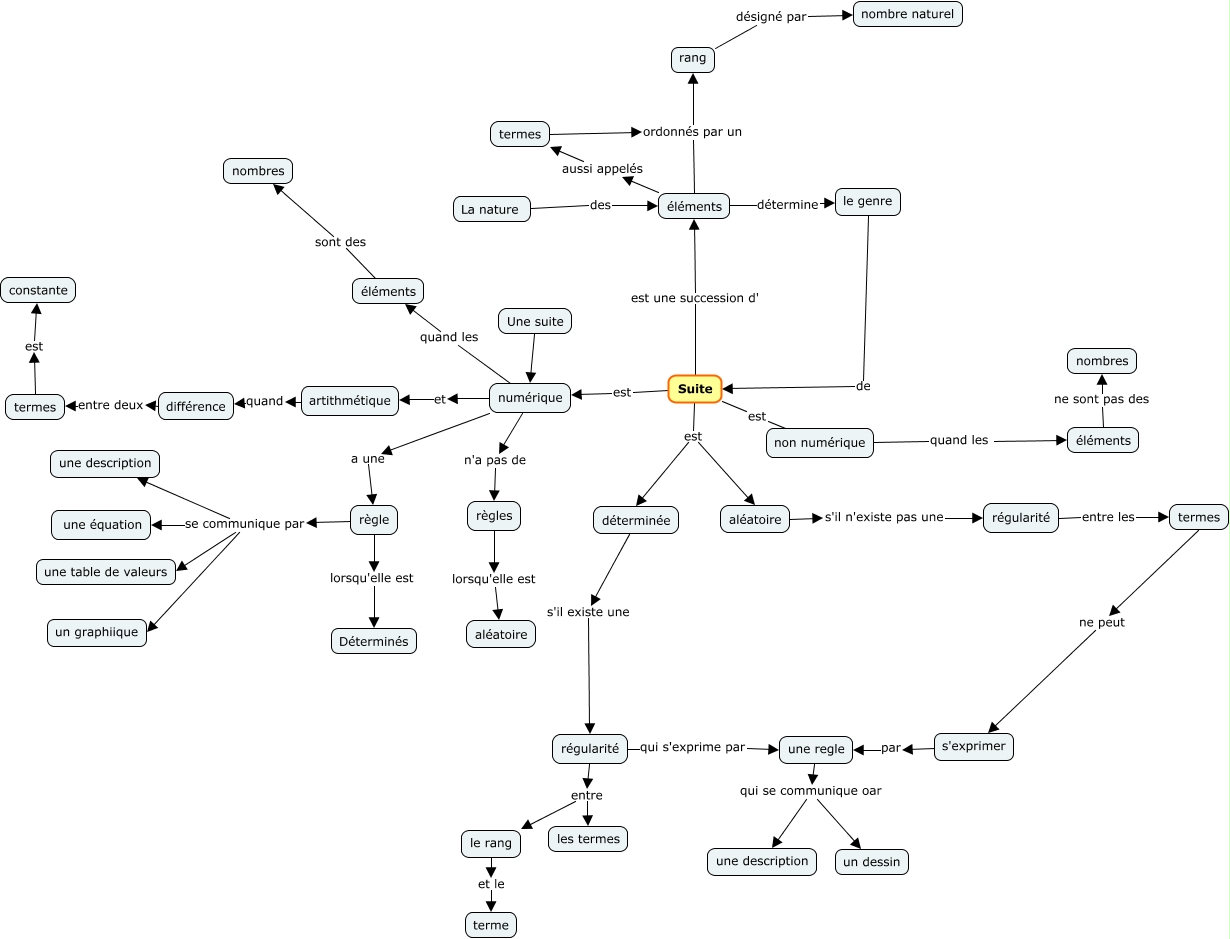 Cette carte de concepts créée avec IHMC CmapTools traite de: Les_suites, Une suite numérique, régularité qui s'exprime par une regle, règle se communique par un graphiique, éléments détermine le genre, une regle qui se communique oar un dessin, règle se communique par une description, numérique quand les éléments, La nature des éléments, règle lorsqu'elle est Déterminés, règles lorsqu'elle est aléatoire, numérique et artithmétique, une regle qui se communique oar une description, termes ne peut s'exprimer, termes ordonnés par un rang, le rang et le terme, termes est constante, numérique n'a pas de règles, éléments ne sont pas des nombres, s'exprimer par une regle, non numérique quand les éléments
