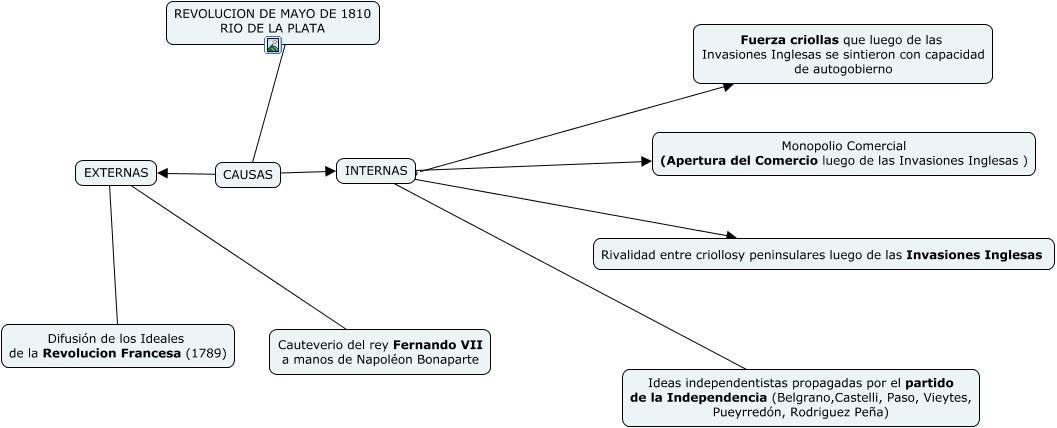 Este Cmap, tiene información relacionada con: Lorena Mondino, INTERNAS ???? Fuerza criollas que luego de las Invasiones Inglesas se sintieron con capacidad de autogobierno, CAUSAS ???? INTERNAS, REVOLUCION DE MAYO DE 1810 RIO DE LA PLATA ???? CAUSAS, CAUSAS ???? EXTERNAS, INTERNAS ???? Monopolio Comercial (Apertura del Comercio luego de las Invasiones Inglesas ), EXTERNAS ???? Cauteverio del rey Fernando VII a manos de Napoléon Bonaparte, INTERNAS ???? Ideas independentistas propagadas por el partido de la Independencia (Belgrano,Castelli, Paso, Vieytes, Pueyrredón, Rodriguez Peña), EXTERNAS ???? Difusión de los Ideales de la Revolucion Francesa (1789), INTERNAS ???? Rivalidad entre criollosy peninsulares luego de las Invasiones Inglesas