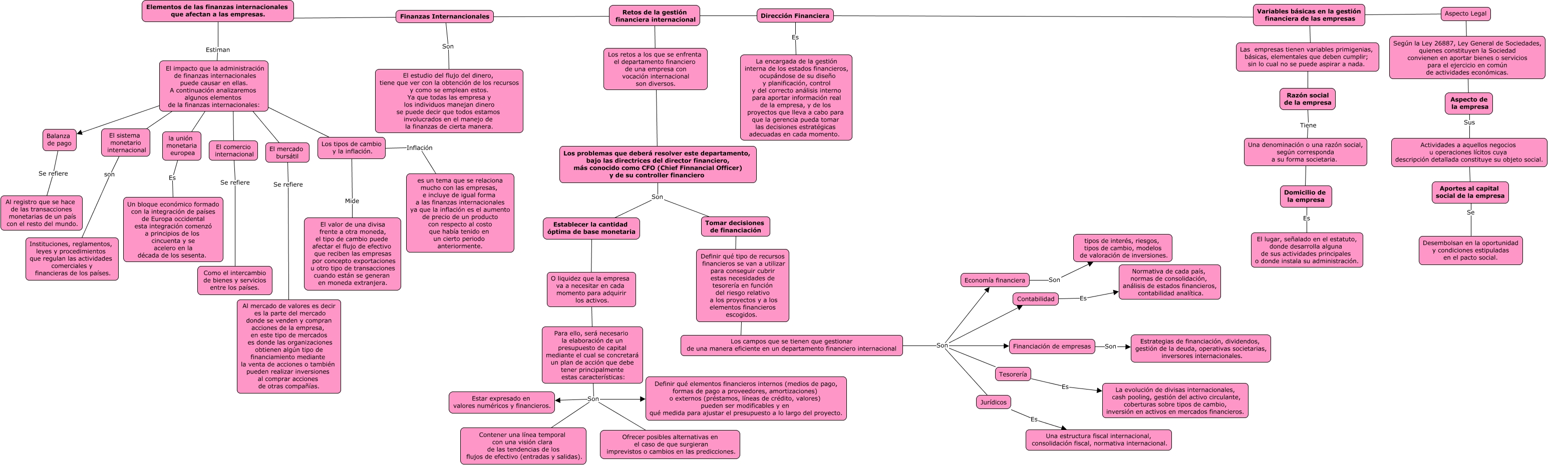 This Concept Map, created with IHMC CmapTools, has information related to: Jenifer Villalta Tarea 3, Los campos que se tienen que gestionar de una manera eficiente en un departamento financiero internacional Son Jurídicos, Los campos que se tienen que gestionar de una manera eficiente en un departamento financiero internacional Son Economía financiera, Actividades a aquellos negocios u operaciones lícitos cuya descripción detallada constituye su objeto social. ???? Aportes al capital social de la empresa, El impacto que la administración de finanzas internacionales puede causar en ellas. A continuación analizaremos algunos elementos de la finanzas internacionales: ???? la unión monetaria europea, Para ello, será necesario la elaboración de un presupuesto de capital mediante el cual se concretará un plan de acción que debe tener principalmente estas características: Son Definir qué elementos financieros internos (medios de pago, formas de pago a proveedores, amortizaciones) o externos (préstamos, líneas de crédito, valores) pueden ser modificables y en qué medida para ajustar el presupuesto a lo largo del proyecto., Tesorería Es La evolución de divisas internacionales, cash pooling, gestión del activo circulante, coberturas sobre tipos de cambio, inversión en activos en mercados financieros., El comercio internacional Se refiere Como el intercambio de bienes y servicios entre los países., Economía financiera Son tipos de interés, riesgos, tipos de cambio, modelos de valoración de inversiones., Elementos de las finanzas internacionales que afectan a las empresas. Estiman El impacto que la administración de finanzas internacionales puede causar en ellas. A continuación analizaremos algunos elementos de la finanzas internacionales:, Los campos que se tienen que gestionar de una manera eficiente en un departamento financiero internacional Son Contabilidad, Contabilidad Es Normativa de cada país, normas de consolidación, análisis de estados financieros, contabilidad analítica., Financiación de empresas Son Estrategias de financiación, dividendos, gestión de la deuda, operativas societarias, inversores internacionales., Para ello, será necesario la elaboración de un presupuesto de capital mediante el cual se concretará un plan de acción que debe tener principalmente estas características: Son Ofrecer posibles alternativas en el caso de que surgieran imprevistos o cambios en las predicciones., Para ello, será necesario la elaboración de un presupuesto de capital mediante el cual se concretará un plan de acción que debe tener principalmente estas características: Son Estar expresado en valores numéricos y financieros., El impacto que la administración de finanzas internacionales puede causar en ellas. A continuación analizaremos algunos elementos de la finanzas internacionales: ???? Balanza de pago, El impacto que la administración de finanzas internacionales puede causar en ellas. A continuación analizaremos algunos elementos de la finanzas internacionales: ???? El sistema monetario internacional, O liquidez que la empresa va a necesitar en cada momento para adquirir los activos. ???? Para ello, será necesario la elaboración de un presupuesto de capital mediante el cual se concretará un plan de acción que debe tener principalmente estas características:, Dirección Financiera ???? Variables básicas en la gestión financiera de las empresas, Los problemas que deberá resolver este departamento, bajo las directrices del director financiero, más conocido como CFO (Chief Finnancial Officer) y de su controller financiero Son Tomar decisiones de financiación, Los problemas que deberá resolver este departamento, bajo las directrices del director financiero, más conocido como CFO (Chief Finnancial Officer) y de su controller financiero Son Establecer la cantidad óptima de base monetaria