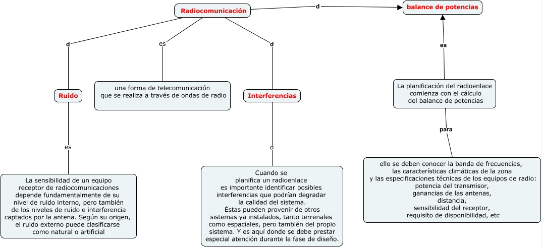Este Cmap, tiene información relacionada con: radioenlace, Radiocomunicación es una forma de telecomunicación que se realiza a través de ondas de radio, Ruido es La sensibilidad de un equipo receptor de radiocomunicaciones depende fundamentalmente de su nivel de ruido interno, pero también de los niveles de ruido e interferencia captados por la antena. Según su origen, el ruido externo puede clasificarse como natural o artificial, Radiocomunicación d Interferencias, Radiocomunicación d balance de potencias, Radiocomunicación d Ruido, Interferencias d Cuando se planifica un radioenlace es importante identificar posibles interferencias que podrían degradar la calidad del sistema. Éstas pueden provenir de otros sistemas ya instalados, tanto terrenales como espaciales, pero también del propio sistema. Y es aquí donde se debe prestar especial atención durante la fase de diseño., La planificación del radioenlace comienza con el cálculo del balance de potencias es balance de potencias, La planificación del radioenlace comienza con el cálculo del balance de potencias para ello se deben conocer la banda de frecuencias, las características climáticas de la zona y las especificaciones técnicas de los equipos de radio: potencia del transmisor, ganancias de las antenas, distancia, sensibilidad del receptor, requisito de disponibilidad, etc