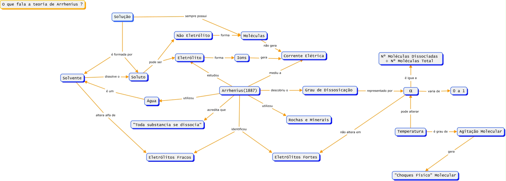 Esse mapa conceitual, produzido no IHMC CmapTools, tem a informação relacionada a: Teoria de Arrhenius, Arrhenius(1887) identificou Eletrólitos Fracos, Solvente altera alfa de Eletrólitos Fracos, Arrhenius(1887) descobriu o Grau de Dissosicação, Arrhenius(1887) estudou Eletrólito, α não altera em Eletrólitos Fortes, Solução sempre possui Moléculas, Temperatura pode alterar α, Agitação Molecular gera "Choques Físico" Molecular, Arrhenius(1887) utilizou Água, α é igua a Nº Moléculas Dissociadas ÷ Nº Moléculas Total, Eletrólito forma Ions, α varia de 0 a 1, Arrhenius(1887) identificou Eletrólitos Fortes, Solução é formada por Solvente, Grau de Dissosicação representado por α, Moléculas não gera Corrente Elétrica, Arrhenius(1887) mediu a Corrente Elétrica, Arrhenius(1887) acredita que "Toda substancia se dissocia", Arrhenius(1887) utilizou Rochas e Minerais, Temperatura é grau de Agitação Molecular
