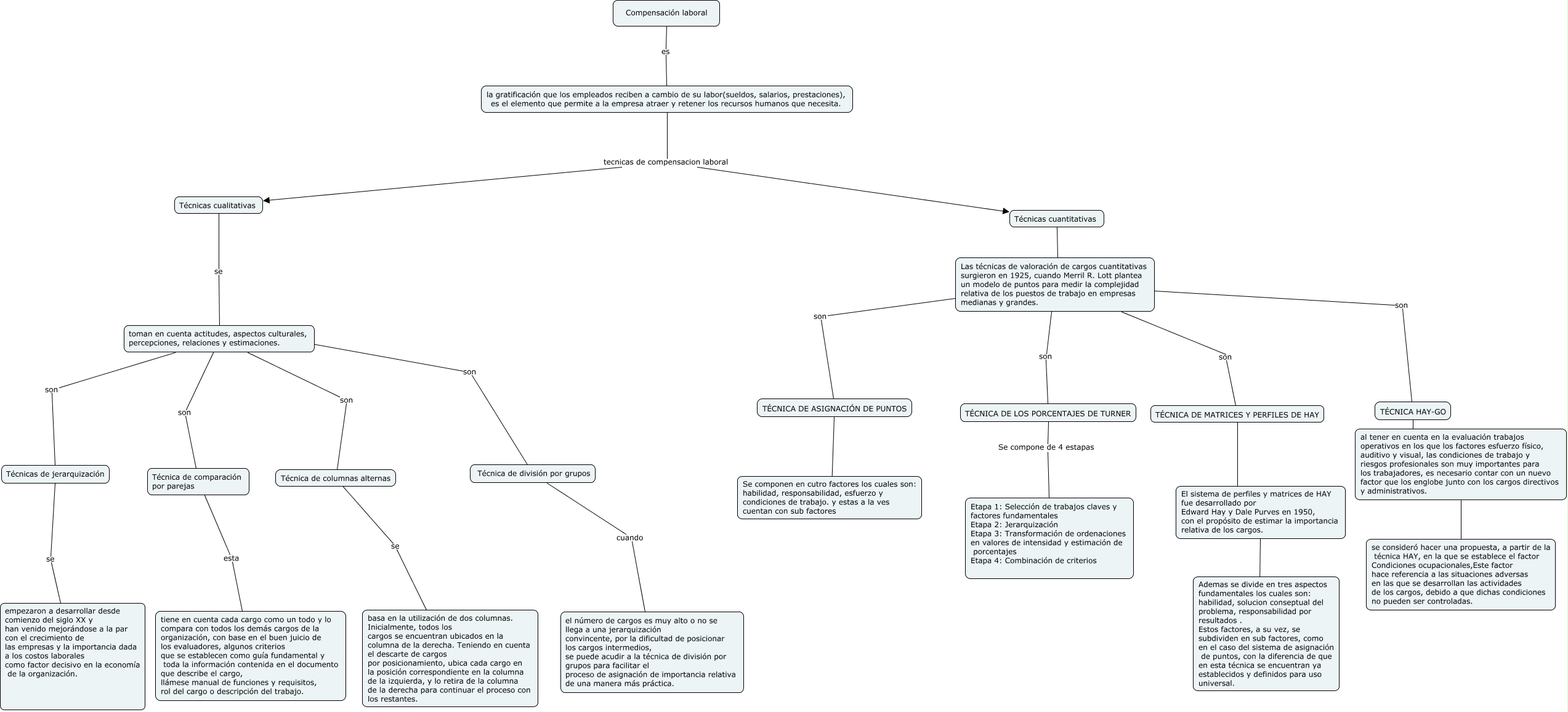 Este Cmap, tiene información relacionada con: mapa gestion, toman en cuenta actitudes, aspectos culturales, percepciones, relaciones y estimaciones. son Técnica de comparación por parejas, toman en cuenta actitudes, aspectos culturales, percepciones, relaciones y estimaciones. son Técnicas de jerarquización, ???? son Técnica de división por grupos, Técnica de columnas alternas se basa en la utilización de dos columnas. Inicialmente, todos los cargos se encuentran ubicados en la columna de la derecha. Teniendo en cuenta el descarte de cargos por posicionamiento, ubica cada cargo en la posición correspondiente en la columna de la izquierda, y lo retira de la columna de la derecha para continuar el proceso con los restantes., TÉCNICA DE MATRICES Y PERFILES DE HAY ???? El sistema de perfiles y matrices de HAY fue desarrollado por Edward Hay y Dale Purves en 1950, con el propósito de estimar la importancia relativa de los cargos., TÉCNICA HAY-GO ???? al tener en cuenta en la evaluación trabajos operativos en los que los factores esfuerzo físico, auditivo y visual, las condiciones de trabajo y riesgos profesionales son muy importantes para los trabajadores, es necesario contar con un nuevo factor que los englobe junto con los cargos directivos y administrativos., toman en cuenta actitudes, aspectos culturales, percepciones, relaciones y estimaciones. son Técnica de columnas alternas, Compensación laboral es la gratificación que los empleados reciben a cambio de su labor(sueldos, salarios, prestaciones), es el elemento que permite a la empresa atraer y retener los recursos humanos que necesita., TÉCNICA DE ASIGNACIÓN DE PUNTOS ???? Se componen en cutro factores los cuales son: habilidad, responsabilidad, esfuerzo y condiciones de trabajo. y estas a la ves cuentan con sub factores, Las técnicas de valoración de cargos cuantitativas surgieron en 1925, cuando Merril R. Lott plantea un modelo de puntos para medir la complejidad relativa de los puestos de trabajo en empresas medianas y grandes. son TÉCNICA DE MATRICES Y PERFILES DE HAY, Las técnicas de valoración de cargos cuantitativas surgieron en 1925, cuando Merril R. Lott plantea un modelo de puntos para medir la complejidad relativa de los puestos de trabajo en empresas medianas y grandes. son TÉCNICA DE ASIGNACIÓN DE PUNTOS, la gratificación que los empleados reciben a cambio de su labor(sueldos, salarios, prestaciones), es el elemento que permite a la empresa atraer y retener los recursos humanos que necesita. tecnicas de compensacion laboral Técnicas cuantitativas, al tener en cuenta en la evaluación trabajos operativos en los que los factores esfuerzo físico, auditivo y visual, las condiciones de trabajo y riesgos profesionales son muy importantes para los trabajadores, es necesario contar con un nuevo factor que los englobe junto con los cargos directivos y administrativos. ???? se consideró hacer una propuesta, a partir de la técnica HAY, en la que se establece el factor Condiciones ocupacionales,Este factor hace referencia a las situaciones adversas en las que se desarrollan las actividades de los cargos, debido a que dichas condiciones no pueden ser controladas., Las técnicas de valoración de cargos cuantitativas surgieron en 1925, cuando Merril R. Lott plantea un modelo de puntos para medir la complejidad relativa de los puestos de trabajo en empresas medianas y grandes. son TÉCNICA HAY-GO, Las técnicas de valoración de cargos cuantitativas surgieron en 1925, cuando Merril R. Lott plantea un modelo de puntos para medir la complejidad relativa de los puestos de trabajo en empresas medianas y grandes. son TÉCNICA DE LOS PORCENTAJES DE TURNER, Técnica de comparación por parejas esta tiene en cuenta cada cargo como un todo y lo compara con todos los demás cargos de la organización, con base en el buen juicio de los evaluadores, algunos criterios que se establecen como guía fundamental y toda la información contenida en el documento que describe el cargo, llámese manual de funciones y requisitos, rol del cargo o descripción del trabajo., la gratificación que los empleados reciben a cambio de su labor(sueldos, salarios, prestaciones), es el elemento que permite a la empresa atraer y retener los recursos humanos que necesita. tecnicas de compensacion laboral Técnicas cualitativas, El sistema de perfiles y matrices de HAY fue desarrollado por Edward Hay y Dale Purves en 1950, con el propósito de estimar la importancia relativa de los cargos. ???? Ademas se divide en tres aspectos fundamentales los cuales son: habilidad, solucion conseptual del problema, responsabilidad por resultados . Estos factores, a su vez, se subdividen en sub factores, como en el caso del sistema de asignación de puntos, con la diferencia de que en esta técnica se encuentran ya establecidos y definidos para uso universal., Técnicas cualitativas se toman en cuenta actitudes, aspectos culturales, percepciones, relaciones y estimaciones., Técnicas de jerarquización se empezaron a desarrollar desde comienzo del siglo XX y han venido mejorándose a la par con el crecimiento de las empresas y la importancia dada a los costos laborales como factor decisivo en la economía de la organización.