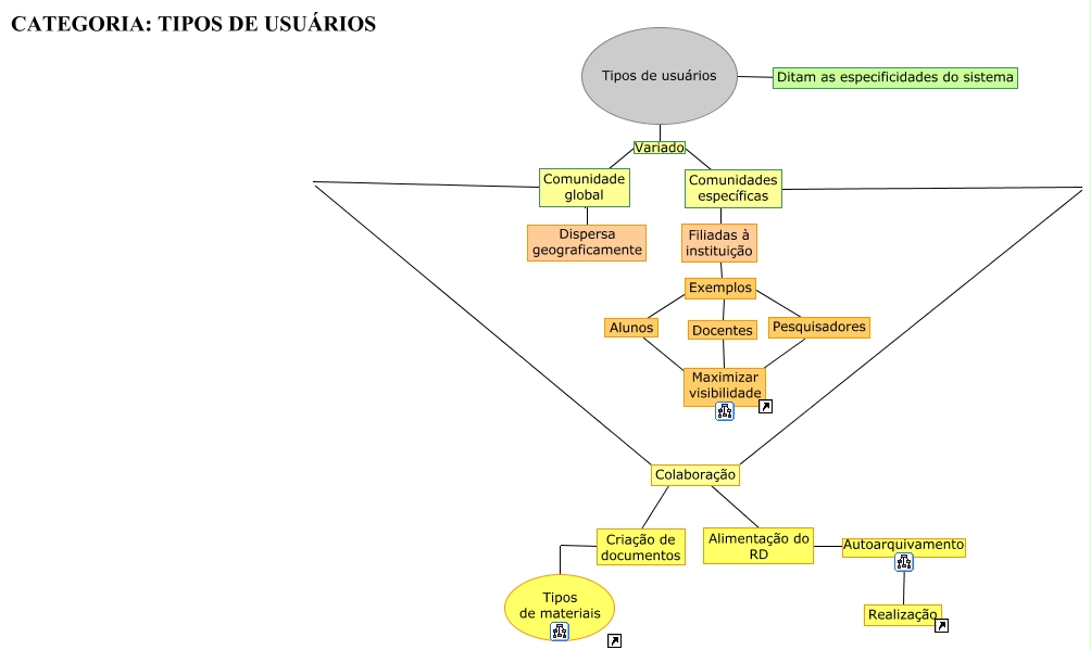 Esse mapa conceitual, produzido no IHMC CmapTools, tem a informação relacionada a: tipos_de_usuarios, Alunos Maximizar visibilidade, Comunidade global Dispersa geograficamente, Alimentação do RD Autoarquivamento Realização, Pesquisadores Maximizar visibilidade, Exemplos Alunos, Exemplos Pesquisadores, Tipos de usuários Variado Comunidades específicas, Colaboração ???? Alimentação do RD, Filiadas à instituição Comunidades específicas, Maximizar visibilidade Docentes, Tipos de materiais Criação de documentos, Tipos de usuários Variado Comunidade global, Tipos de usuários Ditam as especificidades do sistema, Filiadas à instituição Exemplos, Comunidades específicas Colaboração, Exemplos ???? Docentes, Colaboração ???? Criação de documentos, Comunidade global Colaboração