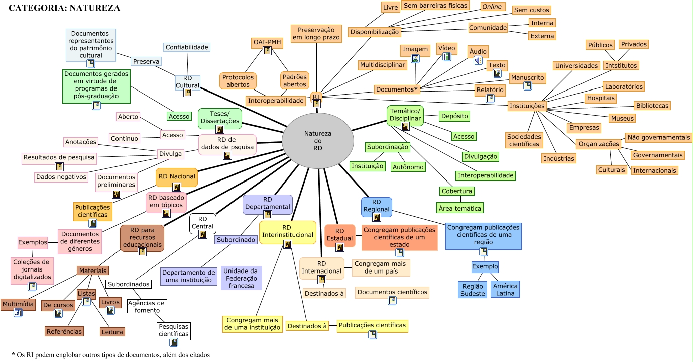 Esse mapa conceitual, produzido no IHMC CmapTools, tem a informação relacionada a: natureza, Documentos* Áudio, Disponibilização Sem barreiras físicas, Natureza do RD Temático/ Disciplinar Interoperabilidade, Documentos* Manuscrito, Materiais De cursos, Natureza do RD RD Regional Congregam publicações científicas de uma região, Congregam publicações científicas de uma região Exemplo Região Sudeste, Natureza do RD RI Instituições, Natureza do RD Temático/ Disciplinar Acesso, Instituições Indústrias, Natureza do RD RD Interinstitucional Congregam mais de uma instituição, Natureza do RD RD de dados de psquisa Acesso, Instituições Bibliotecas, Natureza do RD Temático/ Disciplinar Divulgação, Natureza do RD RD Internacional Destinados à, Acesso Aberto, Acesso Contínuo, Intstitutos Públicos, Subordinado Unidade da Federação francesa, Organizações Internacionais