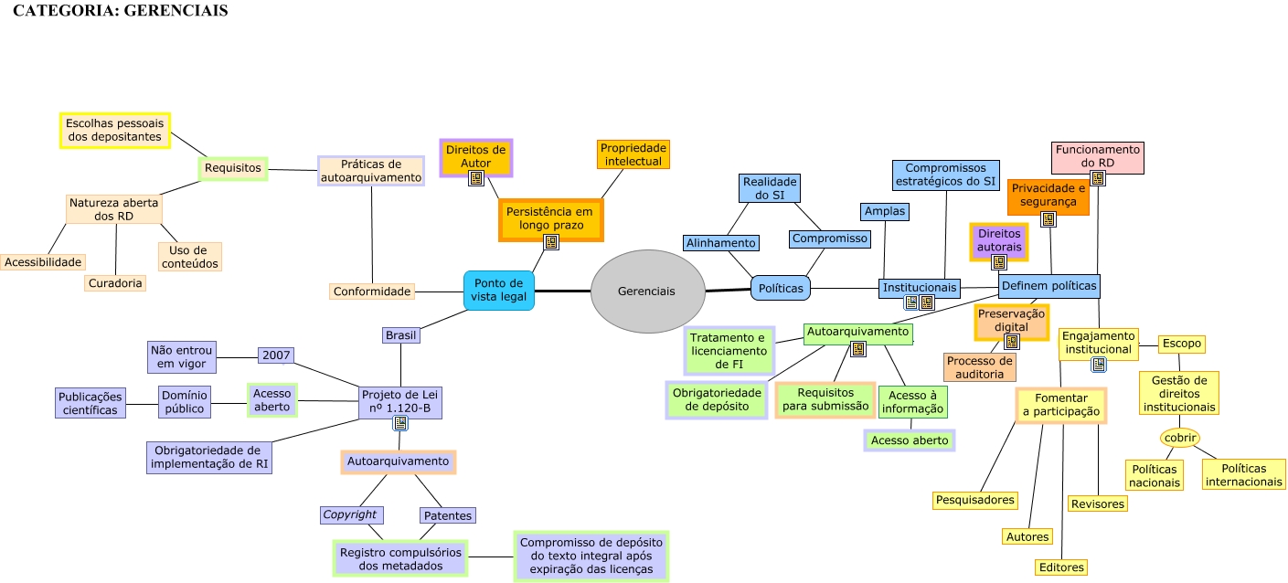 Esse mapa conceitual, produzido no IHMC CmapTools, tem a informação relacionada a: gerenciais, Projeto de Lei nº 1.120-B 2007, Projeto de Lei nº 1.120-B Acesso aberto, Fomentar a participação Pesquisadores, Natureza aberta dos RD Curadoria, Gerenciais Políticas, 2007 Não entrou em vigor, Institucionais Amplas, Engajamento institucional Escopo, Requisitos Natureza aberta dos RD, Autoarquivamento Obrigatoriedade de depósito, Escopo Gestão de direitos institucionais, Persistência em longo prazo Propriedade intelectual, Institucionais Compromissos estratégicos do SI, Definem políticas Privacidade e segurança, Autoarquivamento Requisitos para submissão, Compromisso Realidade do SI, Fomentar a participação Revisores, Projeto de Lei nº 1.120-B Obrigatoriedade de implementação de RI, Alinhamento Realidade do SI, Acesso aberto Domínio público