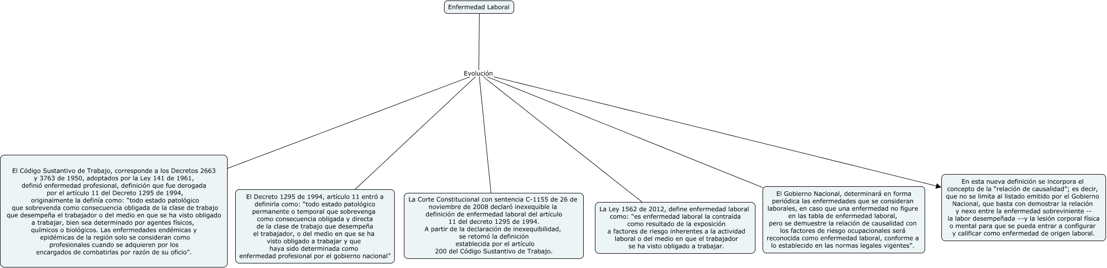 Este Cmap, tiene información relacionada con: Enfermedad Laboral, Enfermedad Laboral Evolución El Gobierno Nacional, determinará en forma periódica las enfermedades que se consideran laborales, en caso que una enfermedad no figure en las tabla de enfermedad laboral, pero se demuestre la relación de causalidad con los factores de riesgo ocupacionales será reconocida como enfermedad laboral, conforme a lo establecido en las normas legales vigentes”., Enfermedad Laboral Evolución En esta nueva definición se incorpora el concepto de la “relación de causalidad”; es decir, que no se limita al listado emitido por el Gobierno Nacional, que basta con demostrar la relación y nexo entre la enfermedad sobreviniente -- la labor desempeñada –-y la lesión corporal física o mental para que se pueda entrar a configurar y calificar como enfermedad de origen laboral., Enfermedad Laboral Evolución La Corte Constitucional con sentencia C-1155 de 26 de noviembre de 2008 declaró inexequible la definición de enfermedad laboral del artículo 11 del decreto 1295 de 1994. A partir de la declaración de inexequibilidad, se retomó la definición establecida por el artículo 200 del Código Sustantivo de Trabajo., Enfermedad Laboral Evolución El Código Sustantivo de Trabajo, corresponde a los Decretos 2663 y 3763 de 1950, adoptados por la Ley 141 de 1961, definió enfermedad profesional, definición que fue derogada por el artículo 11 del Decreto 1295 de 1994, originalmente la definía como: “todo estado patológico que sobrevenda como consecuencia obligada de la clase de trabajo que desempeña el trabajador o del medio en que se ha visto obligado a trabajar, bien sea determinado por agentes físicos, químicos o biológicos. Las enfermedades endémicas y epidémicas de la región solo se consideran como profesionales cuando se adquieren por los encargados de combatirlas por razón de su oficio”., Enfermedad Laboral Evolución La Ley 1562 de 2012, define enfermedad laboral como: “es enfermedad laboral la contraída como resultado de la exposición a factores de riesgo inherentes a la actividad laboral o del medio en que el trabajador se ha visto obligado a trabajar., Enfermedad Laboral Evolución El Decreto 1295 de 1994, artículo 11 entró a definirla como: “todo estado patológico permanente o temporal que sobrevenga como consecuencia obligada y directa de la clase de trabajo que desempeña el trabajador, o del medio en que se ha visto obligado a trabajar y que haya sido determinada como enfermedad profesional por el gobierno nacional”