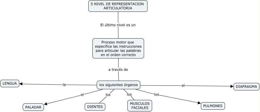 Este Cmap, tiene información relacionada con: 5 Nivel de representacion articulatoria, Proceso motor que especifica las instrucciones para articular las palabras en el orden correcto a través de los siguientes órganos, los siguientes órganos el PALADAR, los siguientes órganos el DIAFRAGMA, los siguientes órganos los PULMONES, los siguientes órganos los DIENTES, los siguientes órganos la LENGUA, los siguientes órganos los MUSCULOS FACIALES, 5 NIVEL DE REPRESENTACION ARTICULATORIA El último nivel es un Proceso motor que especifica las instrucciones para articular las palabras en el orden correcto