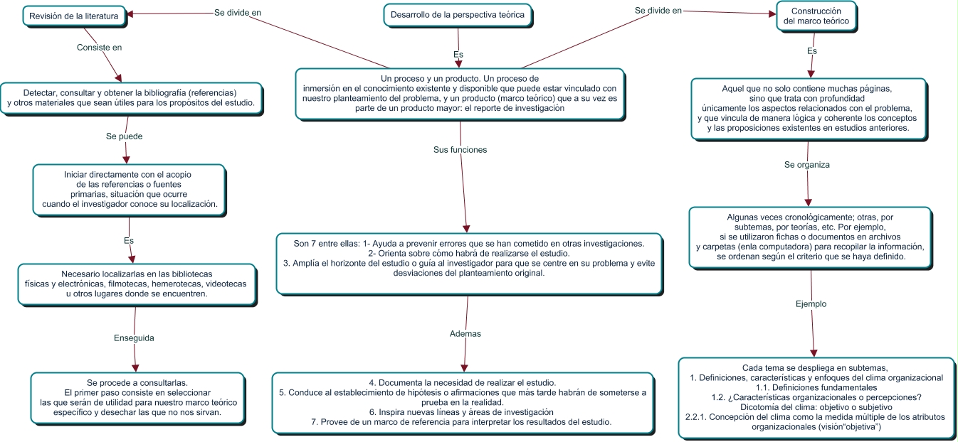 Este Cmap, tiene información relacionada con: METODOLOGIA PASO 3, Necesario localizarlas en las bibliotecas físicas y electrónicas, filmotecas, hemerotecas, videotecas u otros lugares donde se encuentren. Enseguida Se procede a consultarlas. El primer paso consiste en seleccionar las que serán de utilidad para nuestro marco teórico específico y desechar las que no nos sirvan., Aquel que no solo contiene muchas páginas, sino que trata con profundidad únicamente los aspectos relacionados con el problema, y que vincula de manera lógica y coherente los conceptos y las proposiciones existentes en estudios anteriores. Se organiza Algunas veces cronológicamente; otras, por subtemas, por teorías, etc. Por ejemplo, si se utilizaron fichas o documentos en archivos y carpetas (enla computadora) para recopilar la información, se ordenan según el criterio que se haya definido., Desarrollo de la perspectiva teórica Es Un proceso y un producto. Un proceso de inmersión en el conocimiento existente y disponible que puede estar vinculado con nuestro planteamiento del problema, y un producto (marco teórico) que a su vez es parte de un producto mayor: el reporte de investigación, Iniciar directamente con el acopio de las referencias o fuentes primarias, situación que ocurre cuando el investigador conoce su localización. Es Necesario localizarlas en las bibliotecas físicas y electrónicas, filmotecas, hemerotecas, videotecas u otros lugares donde se encuentren., Un proceso y un producto. Un proceso de inmersión en el conocimiento existente y disponible que puede estar vinculado con nuestro planteamiento del problema, y un producto (marco teórico) que a su vez es parte de un producto mayor: el reporte de investigación Sus funciones Son 7 entre ellas: 1- Ayuda a prevenir errores que se han cometido en otras investigaciones. 2- Orienta sobre cómo habrá de realizarse el estudio. 3. Amplía el horizonte del estudio o guía al investigador para que se centre en su problema y evite desviaciones del planteamiento original., Algunas veces cronológicamente; otras, por subtemas, por teorías, etc. Por ejemplo, si se utilizaron fichas o documentos en archivos y carpetas (enla computadora) para recopilar la información, se ordenan según el criterio que se haya definido. Ejemplo Cada tema se despliega en subtemas, 1. Definiciones, características y enfoques del clima organizacional 1.1. Definiciones fundamentales 1.2. ¿Características organizacionales o percepciones? Dicotomía del clima: objetivo o subjetivo 2.2.1. Concepción del clima como la medida múltiple de los atributos organizacionales (visión“objetiva”), Revisión de la literatura Consiste en Detectar, consultar y obtener la bibliografía (referencias) y otros materiales que sean útiles para los propósitos del estudio., Son 7 entre ellas: 1- Ayuda a prevenir errores que se han cometido en otras investigaciones. 2- Orienta sobre cómo habrá de realizarse el estudio. 3. Amplía el horizonte del estudio o guía al investigador para que se centre en su problema y evite desviaciones del planteamiento original. Ademas 4. Documenta la necesidad de realizar el estudio. 5. Conduce al establecimiento de hipótesis o afirmaciones que más tarde habrán de someterse a prueba en la realidad. 6. Inspira nuevas líneas y áreas de investigación 7. Provee de un marco de referencia para interpretar los resultados del estudio., Detectar, consultar y obtener la bibliografía (referencias) y otros materiales que sean útiles para los propósitos del estudio. Se puede Iniciar directamente con el acopio de las referencias o fuentes primarias, situación que ocurre cuando el investigador conoce su localización., Un proceso y un producto. Un proceso de inmersión en el conocimiento existente y disponible que puede estar vinculado con nuestro planteamiento del problema, y un producto (marco teórico) que a su vez es parte de un producto mayor: el reporte de investigación Se divide en Construcción del marco teórico, Un proceso y un producto. Un proceso de inmersión en el conocimiento existente y disponible que puede estar vinculado con nuestro planteamiento del problema, y un producto (marco teórico) que a su vez es parte de un producto mayor: el reporte de investigación Se divide en Revisión de la literatura, Construcción del marco teórico Es Aquel que no solo contiene muchas páginas, sino que trata con profundidad únicamente los aspectos relacionados con el problema, y que vincula de manera lógica y coherente los conceptos y las proposiciones existentes en estudios anteriores.