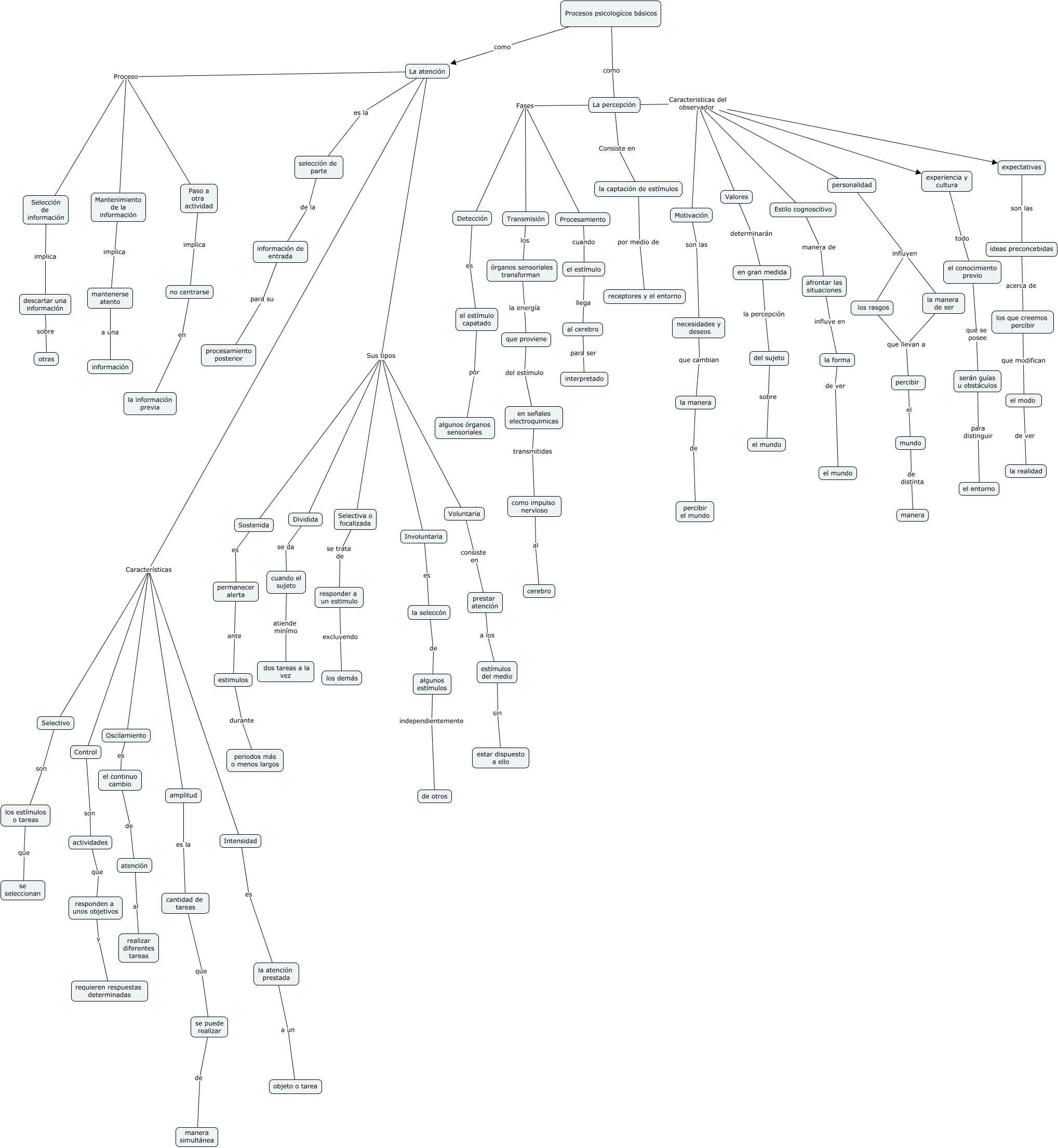 This Concept Map, created with IHMC CmapTools, has information related to: Procesos psicológicos, los rasgos que llevan a percibir, no centrarse en la información previa, el estímulo capatado por algunos órganos sensoriales, se puede realizar de manera simultánea, Procesamiento cuando el estímulo, ideas preconcebidas acerca de los que creemos percibir, necesidades y deseos que cambian la manera, La atención Proceso Mantenimiento de la información, la captación de estímulos por medio de receptores y el entorno, responden a unos objetivos y requieren respuestas determinadas, Selectivo son los estímulos o tareas, la atención prestada a un objeto o tarea, descartar una información sobre otras, La percepción Consiste en la captación de estímulos, La percepción Fases Detección, La atención Características Control, La atención Proceso Selección de información, mantenerse atento a una información, estimulos durante periodos más o menos largos, cuando el sujeto atiende minímo dos tareas a la vez