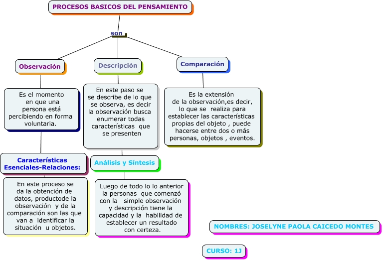 Este Cmap, tiene información relacionada con: PROCESOS DE LOS PENSAMIENTO, PROCESOS BASICOS DEL PENSAMIENTO son Observación, Comparación ???? Es la extensión de la observación,es decir, lo que se realiza para establecer las características propias del objeto , puede hacerse entre dos o más personas, objetos , eventos., Análisis y Síntesis ???? Luego de todo lo lo anterior la personas que comenzó con la simple observación y descripción tiene la capacidad y la habilidad de establecer un resultado con certeza., En este paso se se describe de lo que se observa, es decir la observación busca enumerar todas características que se presenten ???? Análisis y Síntesis, PROCESOS BASICOS DEL PENSAMIENTO son Comparación, Descripción ???? En este paso se se describe de lo que se observa, es decir la observación busca enumerar todas características que se presenten, Características Esenciales-Relaciones: ???? En este proceso se da la obtención de datos, productode la observación y de la comparación son las que van a identificar la situación u objetos., Observación ???? Es el momento en que una persona está percibiendo en forma voluntaria., Es el momento en que una persona está percibiendo en forma voluntaria. ???? Características Esenciales-Relaciones:, PROCESOS BASICOS DEL PENSAMIENTO son Descripción
