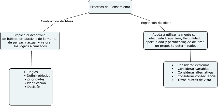 Este Cmap, tiene información relacionada con: IVAN2001, Propicia el desarrollo de hábitos productivos de la mente de pensar y actuar y valorar los logros alcanzados ???? • Reglas • Definir objetivo • prioridades • Planificación • Decisión, Procesos del Pensamiento Expansión de Ideas Ayuda a utilizar la mente con efectividad, apertura, flexibilidad, oportunidad y pertinencia; de acuerdo un propósito determinado., Procesos del Pensamiento Contracción de Ideas Propicia el desarrollo de hábitos productivos de la mente de pensar y actuar y valorar los logros alcanzados, Ayuda a utilizar la mente con efectividad, apertura, flexibilidad, oportunidad y pertinencia; de acuerdo un propósito determinado. ???? • Considerar extremos • Considerar variables • Considerar alternativas • Considerar consecuencia • Otros puntos de vista