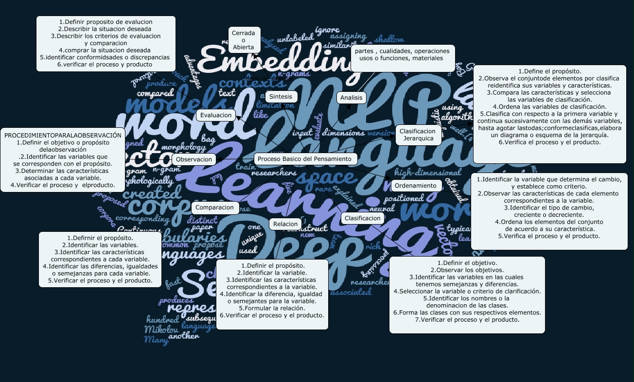 Este Cmap, tiene información relacionada con: Proceso Basico del Pensamiento, Evaluacion ???? 1.Definir proposito de evalucion 2.Describir la situacion deseada 3.Describir los criterios de evaluacion y comparacion 4.comprar la situacion deseada 5.identificar conformidsades o discrepancias 6.verificar el proceso y producto, Analisis ???? partes , cualidades, operaciones usos o funciones, materiales, Proceso Basico del Pensamiento ???? Clasificacion, Proceso Basico del Pensamiento ???? Evaluacion, Clasificacion Jerarquica ???? 1. Define el propósito. 2. Observa el conjunto de elementos por clasifica r e identifica sus variables y características. 3. Compara las características y selecciona las variables de clasificación. 4. Ordena las variables de clasificación. 5. Clasifica con respecto a la primera variable y continua sucesivamente con las demás variables, hasta agotar las todas; conforme clasificas, elabora un diagrama o esquema de la jerarquía. 6. Verifica el proceso y el producto., Proceso Basico del Pensamiento ???? Observacion, Proceso Basico del Pensamiento ???? Ordenamiento, Proceso Basico del Pensamiento ???? Relacion, Clasificacion ???? 1.Definir el objetivo. 2.Observar los objetivos. 3.Identificar las variables en las cuales tenemos semejanzas y diferencias. 4.Seleccionar la variable o criterio de clarificación. 5.Identificar los nombres o la denominacion de las clases. 6.Forma las clases con sus respectivos elementos. 7.Verificar el proceso y el producto., Sintesis tipos de sintesis Cerrada o Abierta, Proceso Basico del Pensamiento ???? Comparacion, Proceso Basico del Pensamiento ???? Sintesis, Ordenamiento ???? 1.Identificar la variable que determina el cambio, y establece como criterio. 2.Observar las características de cada elemento correspondientes a la variable. 3.Identificar el tipo de cambio, creciente o decreciente. 4.Ordena los elementos del conjunto de acuerdo a su característica. 5.Verifica el proceso y el producto., Comparacion ???? 1.Defirnir el propósito. 2.Identificar las variables. 3.Identificar las características correspondientes a cada variable. 4.Identificar las diferencias, igualdades o semejanzas para cada variable. 5.Verificar el proceso y el producto., Observacion ???? PROCEDIMIENTO PARA LA OBSERVACIÓN 1. Definir el objetivo o propósito de la observación . 2. Identificar las variables que se corresponden con el propósito. 3. Determinar las características asociadas a cada variable. 4. Verificar el proceso y el producto., Proceso Basico del Pensamiento ???? Clasificacion Jerarquica, Relacion ???? 1.Definir el propósito. 2.Identificar la variable. 3.Identificar las características correspondientes a la variable. 4.Identificar la diferencia, igualdad o semejantes para la variable. 5.Formular la relación. 6.Verificar el proceso y el producto., Proceso Basico del Pensamiento ???? Analisis