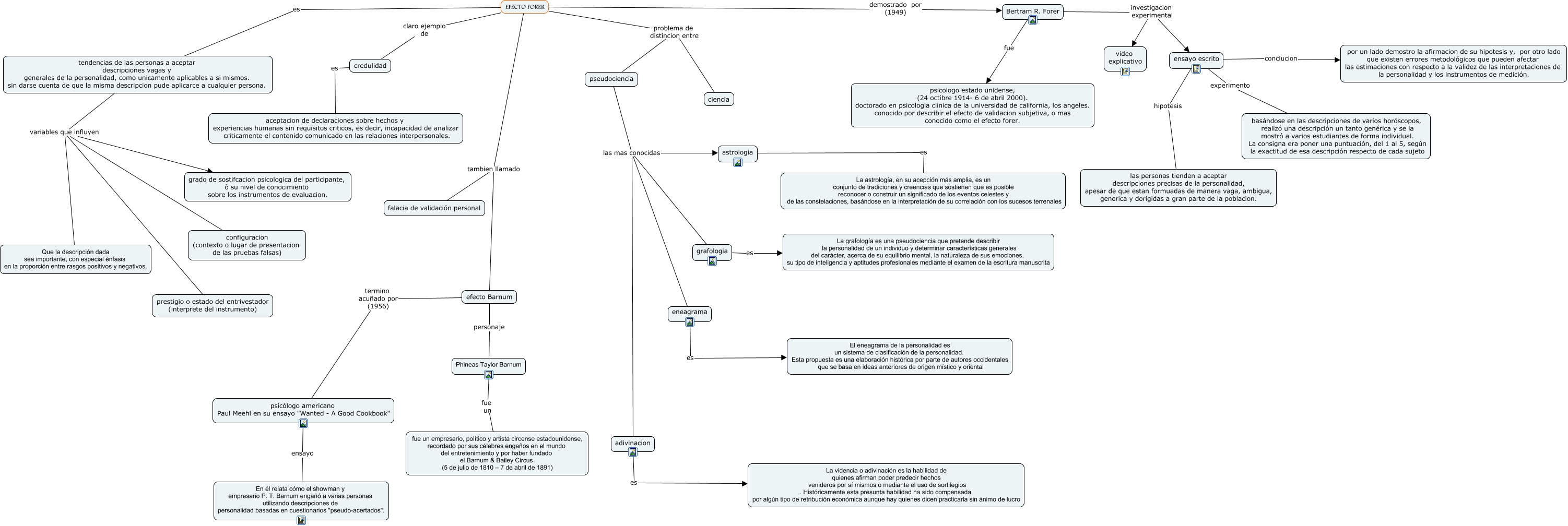 Este Cmap, tiene información relacionada con: escuelas, EFECTO FORER tambien llamado efecto Barnum, tendencias de las personas a aceptar descripciones vagas y generales de la personalidad, como unicamente aplicables a si mismos. sin darse cuenta de que la misma descripcion pude aplicarce a cualquier persona. variables que influyen grado de sostifcacion psicologica del participante, ò su nivel de conocimiento sobre los instrumentos de evaluacion., Phineas Taylor Barnum fue un fue un empresario, político y artista circense estadounidense, recordado por sus célebres engaños en el mundo del entretenimiento y por haber fundado el Barnum & Bailey Circus (5 de julio de 1810 – 7 de abril de 1891), EFECTO FORER es tendencias de las personas a aceptar descripciones vagas y generales de la personalidad, como unicamente aplicables a si mismos. sin darse cuenta de que la misma descripcion pude aplicarce a cualquier persona., eneagrama es El eneagrama de la personalidad es un sistema de clasificación de la personalidad. Esta propuesta es una elaboración histórica por parte de autores occidentales que se basa en ideas anteriores de origen místico y oriental, tendencias de las personas a aceptar descripciones vagas y generales de la personalidad, como unicamente aplicables a si mismos. sin darse cuenta de que la misma descripcion pude aplicarce a cualquier persona. variables que influyen Que la descripción dada sea importante, con especial énfasis en la proporción entre rasgos positivos y negativos., pseudociencia las mas conocidas eneagrama, grafologia es La grafología es una pseudociencia que pretende describir la personalidad de un individuo y determinar características generales del carácter, acerca de su equilibrio mental, la naturaleza de sus emociones, su tipo de inteligencia y aptitudes profesionales mediante el examen de la escritura manuscrita, Bertram R. Forer investigacion experimental video explicativo, psicólogo americano Paul Meehl en su ensayo "Wanted - A Good Cookbook" ensayo En él relata cómo el showman y empresario P. T. Barnum engañó a varias personas utilizando descripciones de personalidad basadas en cuestionarios "pseudo-acertados"., efecto Barnum personaje Phineas Taylor Barnum, ensayo escrito hipotesis las personas tienden a aceptar descripciones precisas de la personalidad, apesar de que estan formuadas de manera vaga, ambigua, generica y dorigidas a gran parte de la poblacion., pseudociencia las mas conocidas grafologia, pseudociencia las mas conocidas astrologia, astrologia es La astrología, en su acepción más amplia, es un conjunto de tradiciones y creencias que sostienen que es posible reconocer o construir un significado de los eventos celestes y de las constelaciones, basándose en la interpretación de su correlación con los sucesos terrenales, tendencias de las personas a aceptar descripciones vagas y generales de la personalidad, como unicamente aplicables a si mismos. sin darse cuenta de que la misma descripcion pude aplicarce a cualquier persona. variables que influyen configuracion (contexto o lugar de presentacion de las pruebas falsas), EFECTO FORER problema de distincion entre pseudociencia, EFECTO FORER problema de distincion entre ciencia, ensayo escrito experimento basándose en las descripciones de varios horóscopos, realizó una descripción un tanto genérica y se la mostró a varios estudiantes de forma individual. La consigna era poner una puntuación, del 1 al 5, según la exactitud de esa descripción respecto de cada sujeto, credulidad es aceptacion de declaraciones sobre hechos y experiencias humanas sin requisitos criticos, es decir, incapacidad de analizar criticamente el contenido comunicado en las relaciones interpersonales.