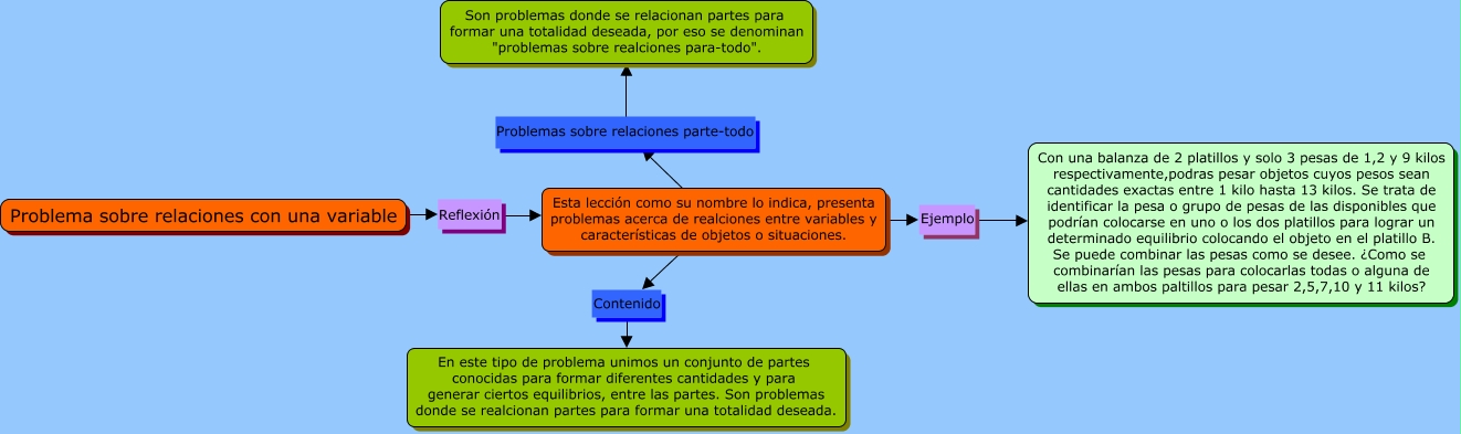 Este Cmap, tiene información relacionada con: Problemas sobre realciones con una variable, Esta lección como su nombre lo indica, presenta problemas acerca de realciones entre variables y características de objetos o situaciones. Problemas sobre relaciones parte-todo Son problemas donde se relacionan partes para formar una totalidad deseada, por eso se denominan "problemas sobre realciones para-todo"., Esta lección como su nombre lo indica, presenta problemas acerca de realciones entre variables y características de objetos o situaciones. Contenido En este tipo de problema unimos un conjunto de partes conocidas para formar diferentes cantidades y para generar ciertos equilibrios, entre las partes. Son problemas donde se realcionan partes para formar una totalidad deseada., Esta lección como su nombre lo indica, presenta problemas acerca de realciones entre variables y características de objetos o situaciones. Ejemplo Con una balanza de 2 platillos y solo 3 pesas de 1,2 y 9 kilos respectivamente,podras pesar objetos cuyos pesos sean cantidades exactas entre 1 kilo hasta 13 kilos. Se trata de identificar la pesa o grupo de pesas de las disponibles que podrían colocarse en uno o los dos platillos para lograr un determinado equilibrio colocando el objeto en el platillo B. Se puede combinar las pesas como se desee. ¿Como se combinarían las pesas para colocarlas todas o alguna de ellas en ambos paltillos para pesar 2,5,7,10 y 11 kilos?, Problema sobre relaciones con una variable Reflexión Esta lección como su nombre lo indica, presenta problemas acerca de realciones entre variables y características de objetos o situaciones.