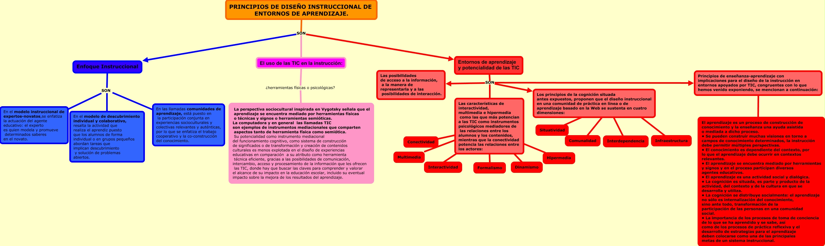 Este Cmap, tiene información relacionada con: Principios de diseño instruccional de entornos de aprendizaje apoyados con TIC un marco de referencia sociocultural y situado, Las características de interactividad, multimedia e hipermedia como las que más potencian a las TIC como instrumentos psicológicos mediadores de las relaciones entre los alumnos y los contenidos, mientras que la conectividad potencia las relaciones entre los actores: ???? Formalismo, PRINCIPIOS DE DISEÑO INSTRUCCIONAL DE ENTORNOS DE APRENDIZAJE. SON El uso de las TIC en la instrucción:, Las características de interactividad, multimedia e hipermedia como las que más potencian a las TIC como instrumentos psicológicos mediadores de las relaciones entre los alumnos y los contenidos, mientras que la conectividad potencia las relaciones entre los actores: ???? Interactividad, Los principios de la cognición situada antes expuestos, proponen que el diseño instruccional en una comunidad de práctica en línea o de aprendizaje basado en la Web se sustenta en cuatro dimensiones: ???? Situatividad, Entornos de aprendizaje y potencialidad de las TIC SON Las características de interactividad, multimedia e hipermedia como las que más potencian a las TIC como instrumentos psicológicos mediadores de las relaciones entre los alumnos y los contenidos, mientras que la conectividad potencia las relaciones entre los actores:, Principios de enseñanza-aprendizaje con implicaciones para el diseño de la instrucción en entornos apoyados por TIC, congruentes con lo que hemos venido exponiendo, se mencionan a continuación: ???? El aprendizaje es un proceso de construcción de conocimiento y la enseñanza una ayuda asistida o mediada a dicho proceso. • Se pueden construir muchas visiones en torno a campos de conocimiento determinados, la instrucción debe permitir múltiples perspectivas. • El conocimiento es dependiente del contexto, por lo que el aprendizaje debe ocurrir en contextos relevantes. • El aprendizaje se encuentra mediado por herramientas y signos y en el proceso participan diversos agentes educativos. • El aprendizaje es una actividad social y dialógica. • La cognición es situada, es parte y producto de la actividad, del contexto y de la cultura en que se desarrolla y utiliza. • La cognición se distribuye socialmente: el aprendizaje no sólo es internalización del conocimiento, sino ante todo, transformación de la participación de las personas en una comunidad social. • La importancia de los procesos de toma de conciencia de lo que se ha aprendido y se sabe, así como de los procesos de práctica reflexiva y el desarrollo de estrategias para el aprendizaje deben colocarse como una de las principales metas de un sistema instruccional., Entornos de aprendizaje y potencialidad de las TIC SON Las posibilidades de acceso a la información, a la manera de representarla y a las posibilidades de interacción., Entornos de aprendizaje y potencialidad de las TIC SON Los principios de la cognición situada antes expuestos, proponen que el diseño instruccional en una comunidad de práctica en línea o de aprendizaje basado en la Web se sustenta en cuatro dimensiones:, Las características de interactividad, multimedia e hipermedia como las que más potencian a las TIC como instrumentos psicológicos mediadores de las relaciones entre los alumnos y los contenidos, mientras que la conectividad potencia las relaciones entre los actores: ???? Hipermedia, Los principios de la cognición situada antes expuestos, proponen que el diseño instruccional en una comunidad de práctica en línea o de aprendizaje basado en la Web se sustenta en cuatro dimensiones: ???? Comunalidad, Los principios de la cognición situada antes expuestos, proponen que el diseño instruccional en una comunidad de práctica en línea o de aprendizaje basado en la Web se sustenta en cuatro dimensiones: ???? Interdependencia, PRINCIPIOS DE DISEÑO INSTRUCCIONAL DE ENTORNOS DE APRENDIZAJE. SON Enfoque Instruccional, Las características de interactividad, multimedia e hipermedia como las que más potencian a las TIC como instrumentos psicológicos mediadores de las relaciones entre los alumnos y los contenidos, mientras que la conectividad potencia las relaciones entre los actores: ???? Multimedia, Enfoque Instruccional SON En el modelo de descubrimiento individual y colaborativo, resalta la actividad que realiza el aprendiz puesto que los alumnos de forma individual o en grupos pequeños abordan tareas que implican descubrimiento y solución de problemas abiertos., Enfoque Instruccional SON En el modelo instruccional de expertos-novatos,se enfatiza la actuación del agente educativo: el experto es quien modela y promueve determinados saberes en el novato., Enfoque Instruccional SON En las llamadas comunidades de aprendizaje, está puesto en la participación conjunta en experiencias socioculturales y colectivas relevantes y auténticas, por lo que se enfatiza el trabajo cooperativo y la co-construcción del conocimiento., Las características de interactividad, multimedia e hipermedia como las que más potencian a las TIC como instrumentos psicológicos mediadores de las relaciones entre los alumnos y los contenidos, mientras que la conectividad potencia las relaciones entre los actores: ???? Dinamismo, El uso de las TIC en la instrucción: ¿herramientas físicas o psicológicas? La perspectiva sociocultural inspirada en Vygotsky señala que el aprendizaje se encuentra mediado por herramientas físicas o técnicas y signos o herramientas semióticas. La computadora y en general las llamadas TIC son ejemplos de instrumentos mediacionales que comparten aspectos tanto de herramienta física como semiótica. Su potencialidad como instrumento mediacional del funcionamiento cognitivo, como sistema de construcción de significados o de transformación y creación de contenidos culturales es menos explotada en el diseño de experiencias educativas 