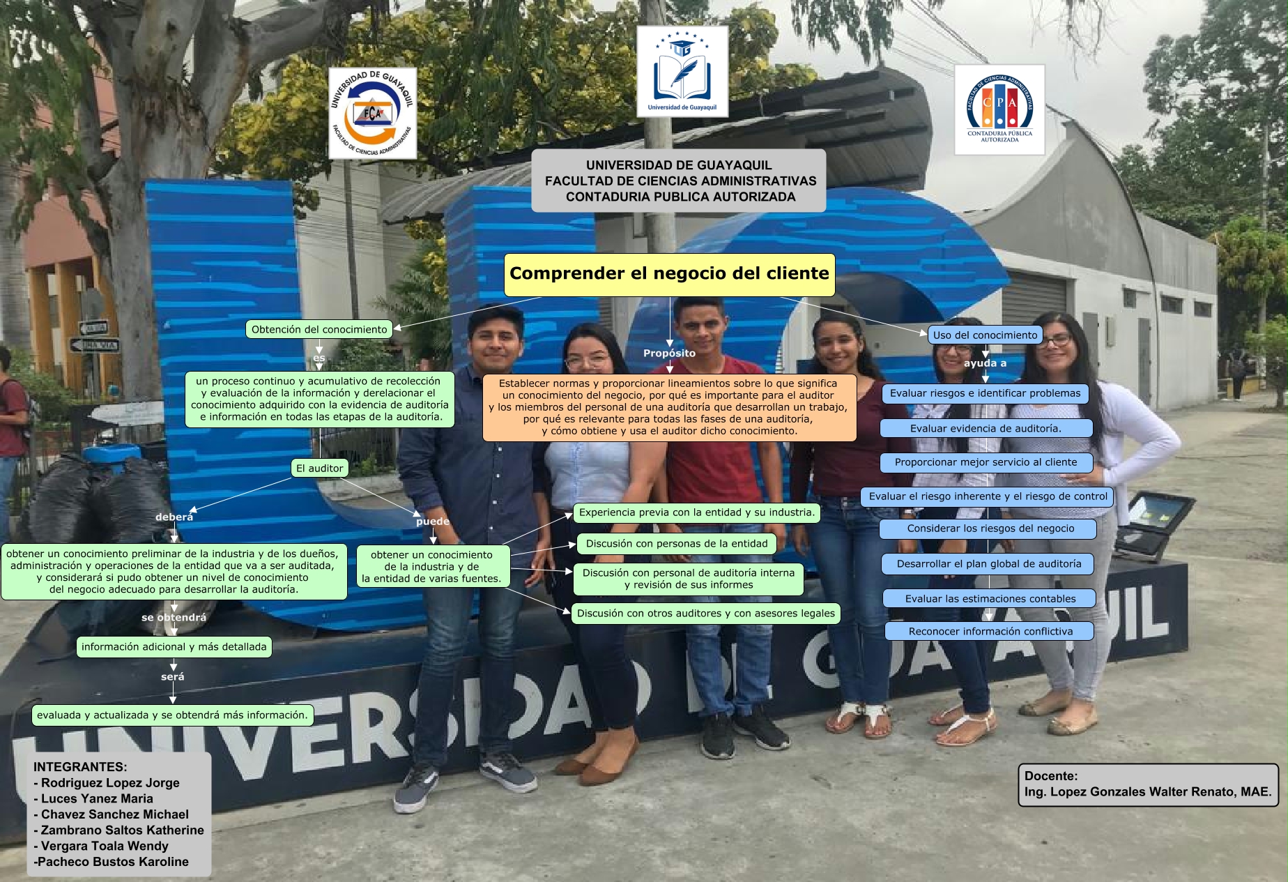 Este Cmap, tiene información relacionada con: comprender el negocio del cliente, Comprender el negocio del cliente ???? Uso del conocimiento, Considerar los riesgos del negocio ???? Desarrollar el plan global de auditoría, obtener un conocimiento de la industria y de la entidad de varias fuentes. ???? Discusión con personas de la entidad, Evaluar el riesgo inherente y el riesgo de control ???? Considerar los riesgos del negocio, Proporcionar mejor servicio al cliente ???? Evaluar el riesgo inherente y el riesgo de control, Uso del conocimiento ayuda a Evaluar riesgos e identificar problemas, Comprender el negocio del cliente Propósito Establecer normas y proporcionar lineamientos sobre lo que significa un conocimiento del negocio, por qué es importante para el auditor y los miembros del personal de una auditoría que desarrollan un trabajo, por qué es relevante para todas las fases de una auditoría, y cómo obtiene y usa el auditor dicho conocimiento., obtener un conocimiento de la industria y de la entidad de varias fuentes. ???? Experiencia previa con la entidad y su industria., obtener un conocimiento de la industria y de la entidad de varias fuentes. ???? Discusión con personal de auditoría interna y revisión de sus informes, Evaluar riesgos e identificar problemas ???? Evaluar evidencia de auditoría., Comprender el negocio del cliente ???? Obtención del conocimiento, El auditor ???? un proceso continuo y acumulativo de recolección y evaluación de la información y derelacionar el conocimiento adquirido con la evidencia de auditoría e información en todas las etapas de la auditoría., El auditor deberá obtener un conocimiento preliminar de la industria y de los dueños, administración y operaciones de la entidad que va a ser auditada, y considerará si pudo obtener un nivel de conocimiento del negocio adecuado para desarrollar la auditoría., Obtención del conocimiento es un proceso continuo y acumulativo de recolección y evaluación de la información y derelacionar el conocimiento adquirido con la evidencia de auditoría e información en todas las etapas de la auditoría., Desarrollar el plan global de auditoría ???? Evaluar las estimaciones contables, obtener un conocimiento preliminar de la industria y de los dueños, administración y operaciones de la entidad que va a ser auditada, y considerará si pudo obtener un nivel de conocimiento del negocio adecuado para desarrollar la auditoría. se obtendrá información adicional y más detallada, información adicional y más detallada será evaluada y actualizada y se obtendrá más información., Evaluar evidencia de auditoría. ???? Proporcionar mejor servicio al cliente, El auditor puede obtener un conocimiento de la industria y de la entidad de varias fuentes., Evaluar las estimaciones contables ???? Reconocer información conflictiva